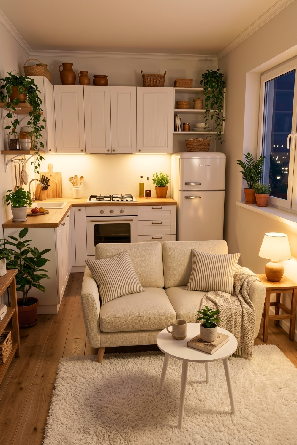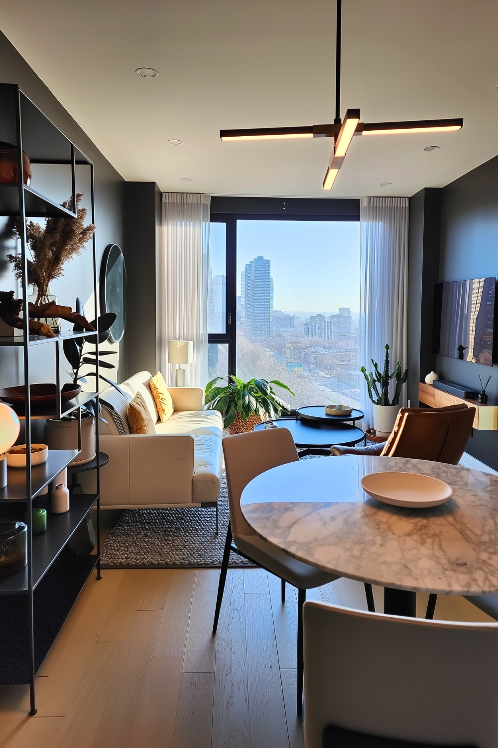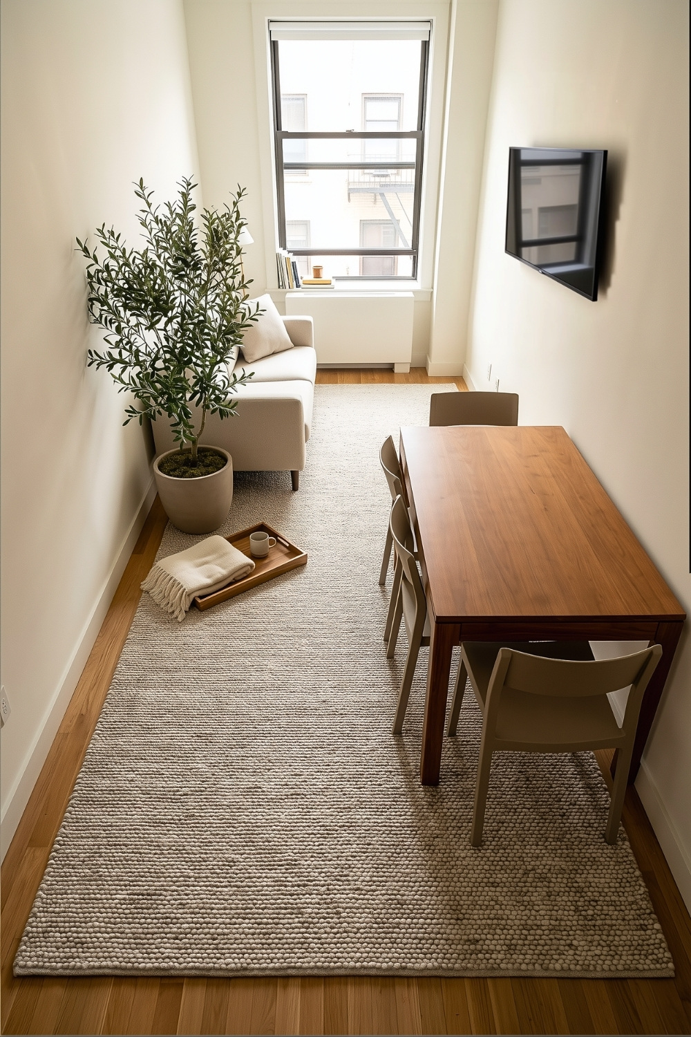 I really admire how this open concept layout uses the available space to make a tiny apartment feel calm. Having a rectangular dining surface right next to the seating area creates a living and dining room ideas combined look that flows naturally. Using neutral tones and soft rugs solves the problem of crowding while keeping the interior warm.