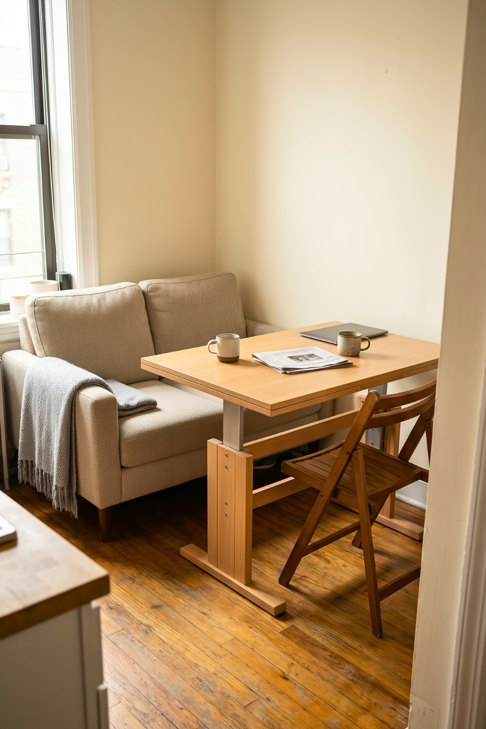 Finding furniture that works double duty is my secret weapon for living in a condo where every square inch counts. I love this adjustable wooden table because it transitions seamlessly from a work desk to a dining surface, keeping the neutral beige aesthetic calm and uncluttered throughout the day.