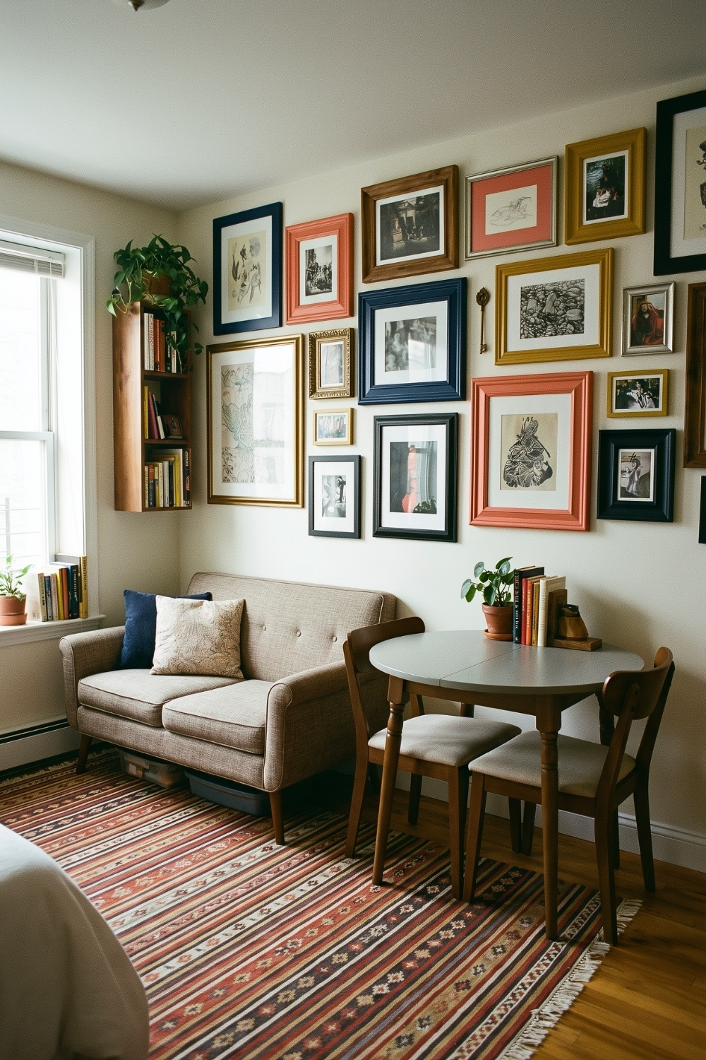 I am obsessed with how a gallery wall can distract the eye and make small spaces feel curated rather than cluttered. This setup uses a cozy boho rug and mixed frame styles to blend the sofa area and dining table into one cohesive, lived-in masterpiece that feels incredibly personal.