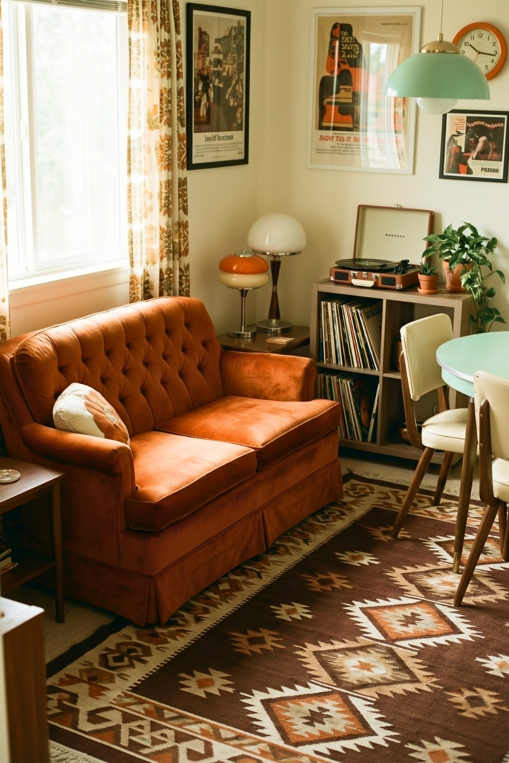 I’m a firm believer that a classic interior doesn’t have to be boring, especially when you play with rich brown tones and velvet textures. Even in a small condo, adding a tufted sofa and a patterned carpet makes the living and dining room ideas combined feel incredibly high-end and intentional.