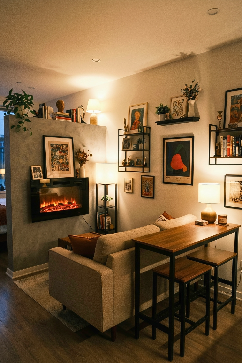 If you’re living in a contemporary apartment, a sleek fireplace TV wall can act as a stunning divider that defines the zone without blocking the light. I’m a huge fan of using a slim, high table behind the sofa to create a dual purpose living dining room that maximizes every square inch of the gray interior. The warm glow from the lamps makes this eating space in the living room feel like a sophisticated bistro, proving that small layouts can still feel incredibly high-end.