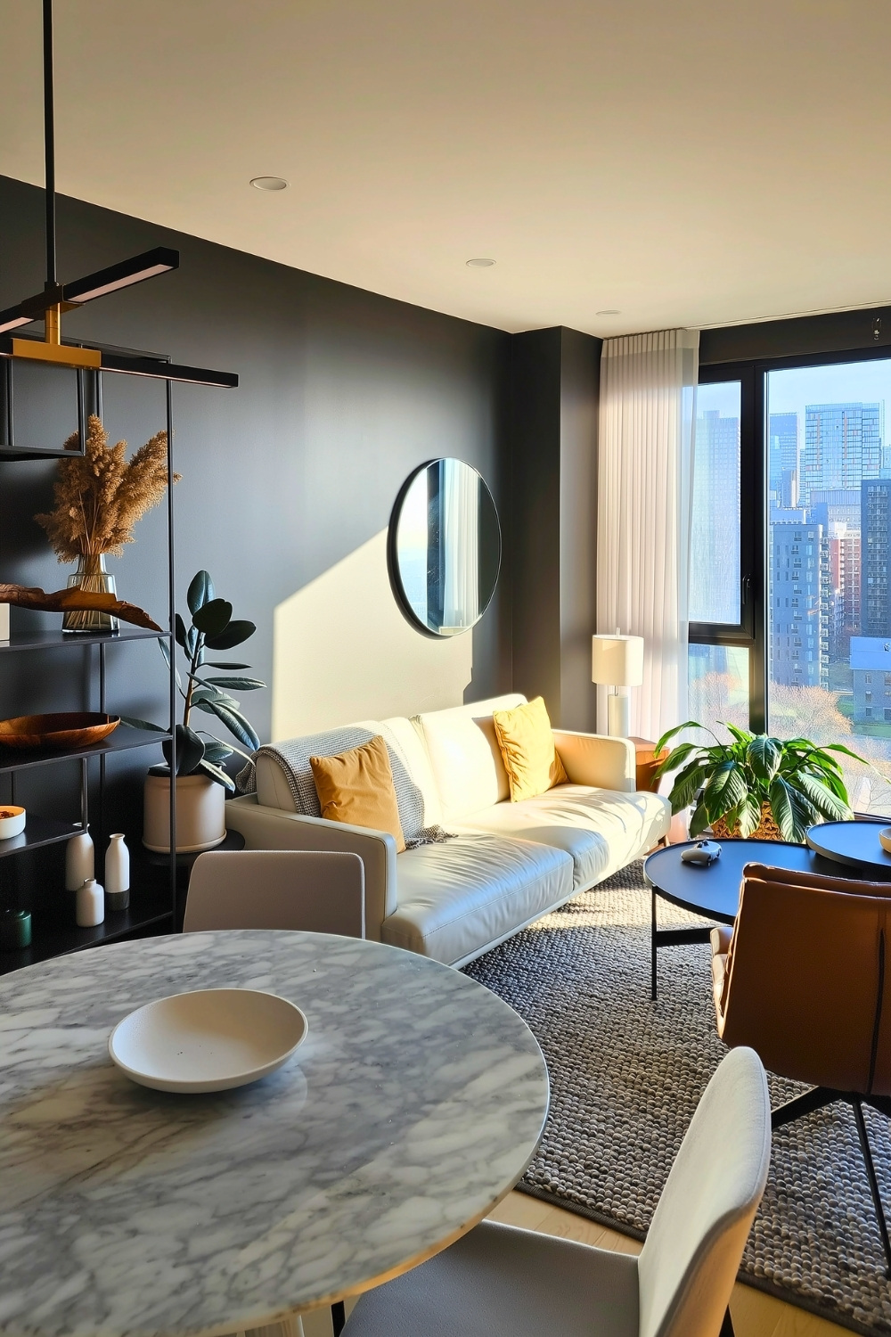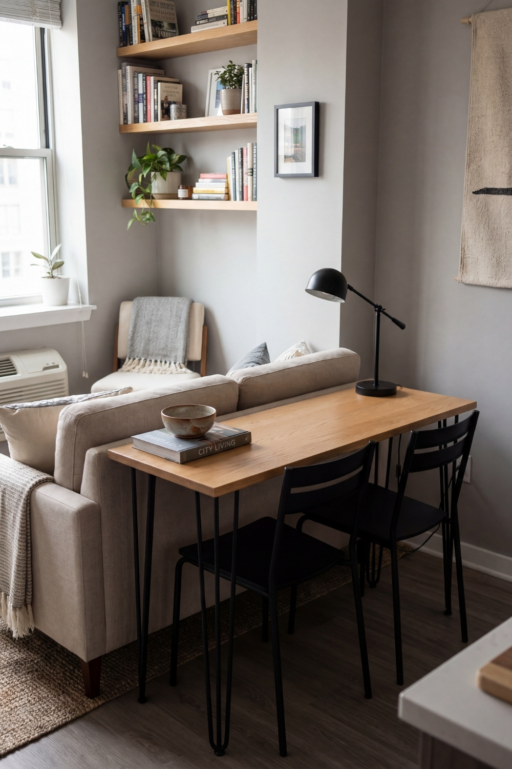 To maximize every inch of small spaces, I love the trick of placing a slim console behind the sofa to create a dual purpose living dining room. This contemporary setup in gray and black tones keeps the open concept feeling airy while giving me a dedicated spot to eat or work.