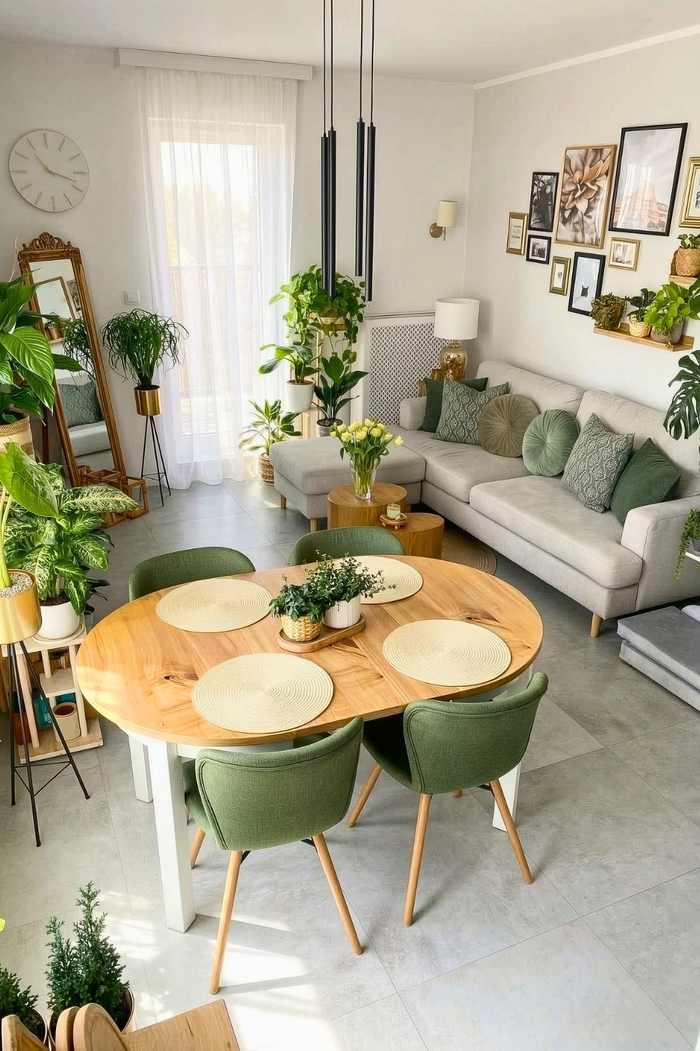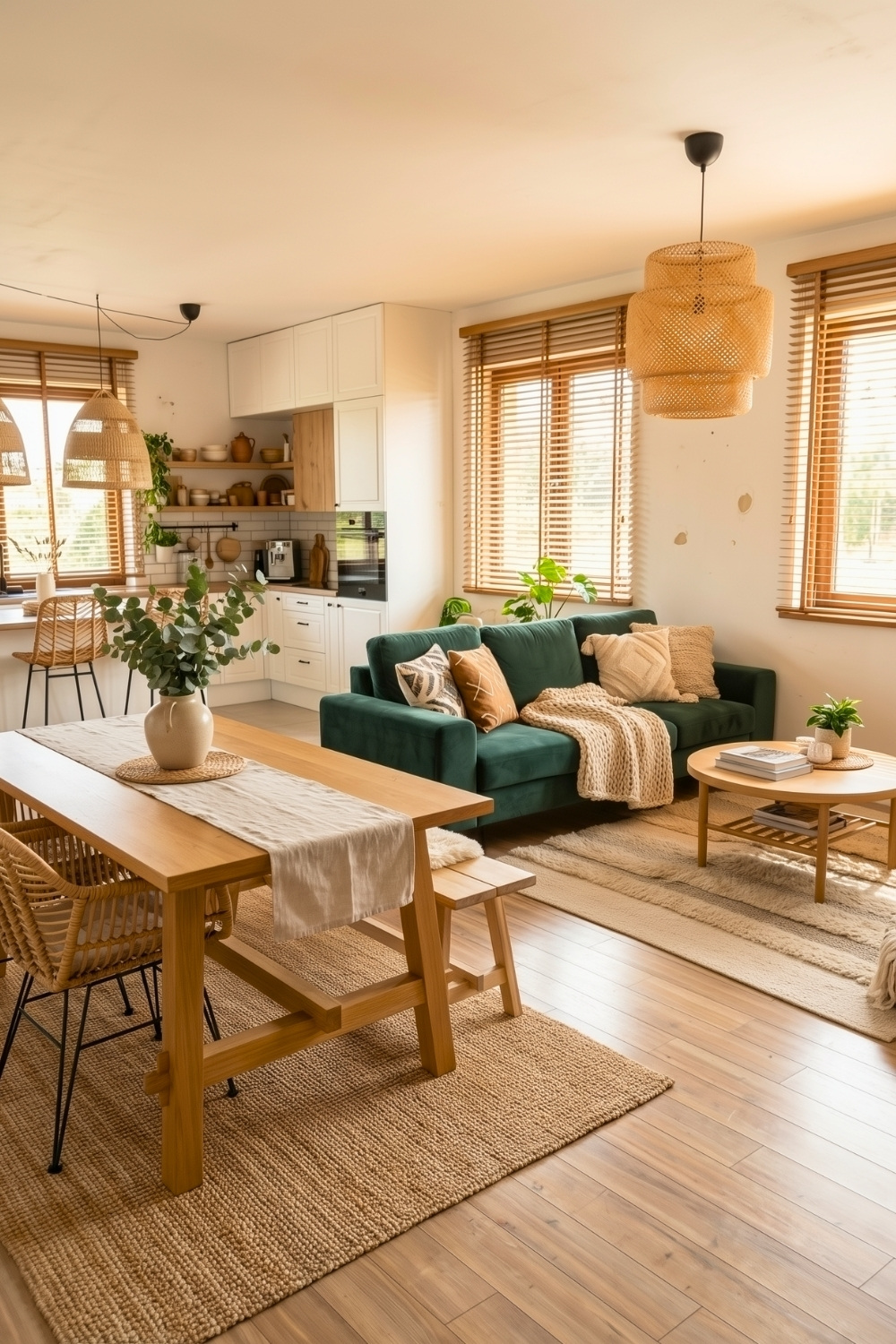 If you live in an apartment with just one main room, you’ll find that this idea makes everything feel organized rather than chaotic. My favorite part is how the rugs act as a boundary for the dining area so it doesn’t just feel like it is floating in space. That soft green couch and the woven lights make the whole cozy vibe feel effortless.