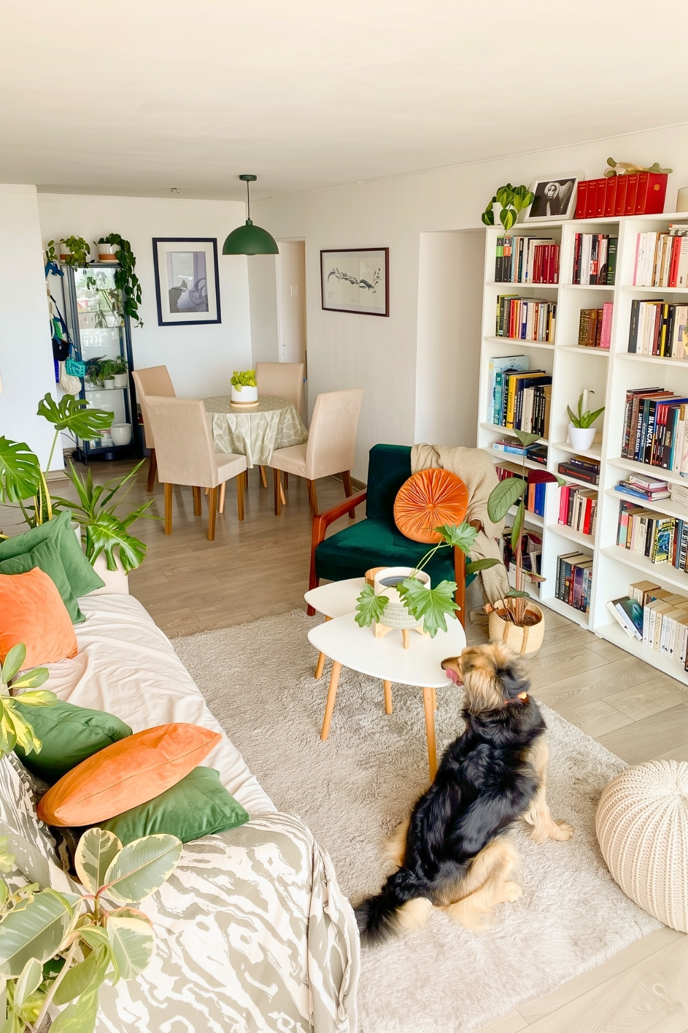 This space feels so genuine to me, like a spot where I’d actually enjoy eating a meal before melting into the cushions. I love how the dining table sits so close to the sofa, making the layout perfect for small spaces while still keeping a clear path to walk. Those green plants and warm brown wood tones provide the perfect amount of decor without making the interior feel cluttered or busy.