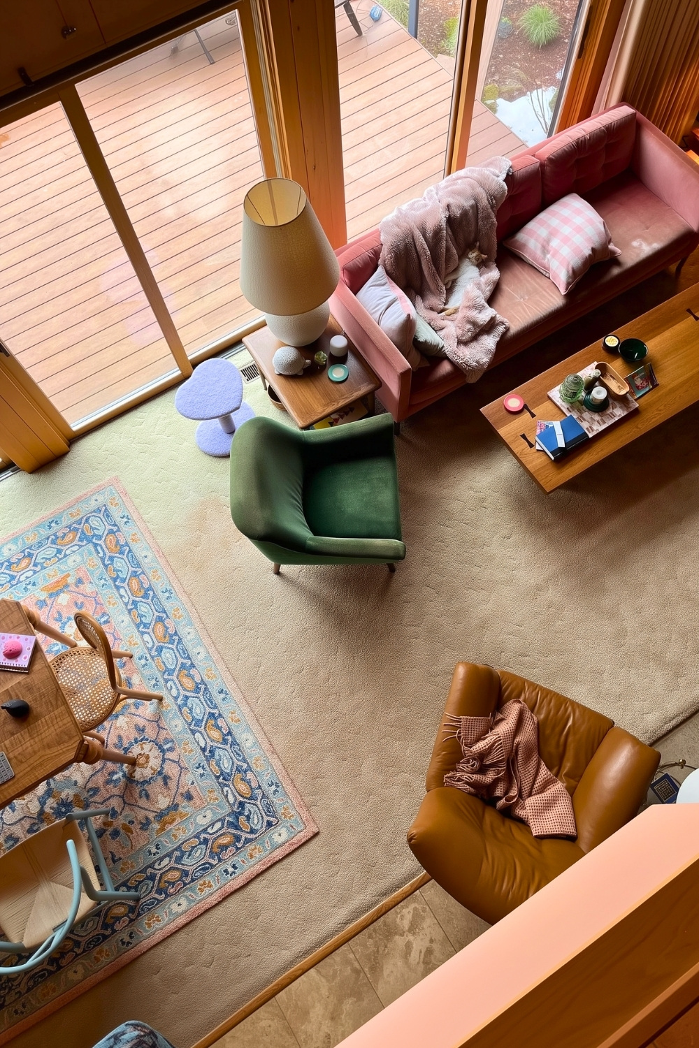 I’m quite obsessed with the handmade table and how the pops of color make the living and dining room ideas combined feel lived-in.
