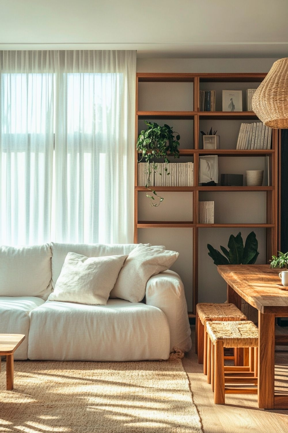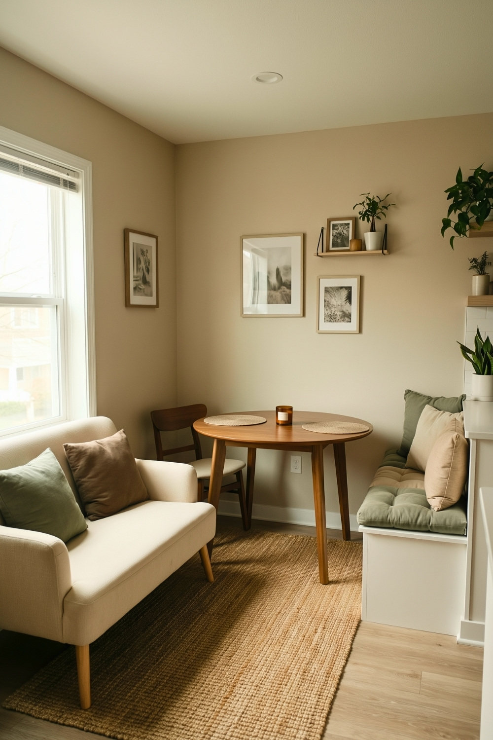 I’ve found that one of the smartest ways to handle a narrow or small room is to let your main furniture do double duty. By placing a round wooden table right next to the sofa and adding a built-in bench, you essentially create a dining room with an extra seating area that feels like a custom nook. This neutral layout uses soft green cushions to tie everything together, making the whole corner feel intentional and tucked away.