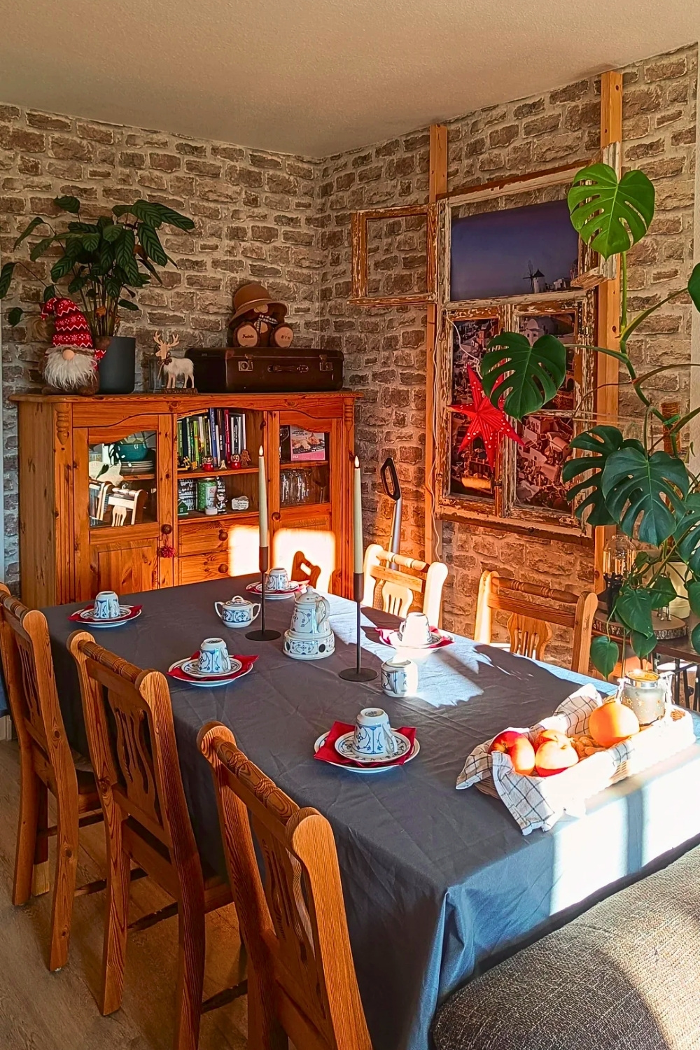 u/Pinkpurplegreentea created a space that feels like a warm hug thanks to the soft carpet and layered rugs. This dining room with an extra seating area has a lovely boho and rustic charm that feels very personal.