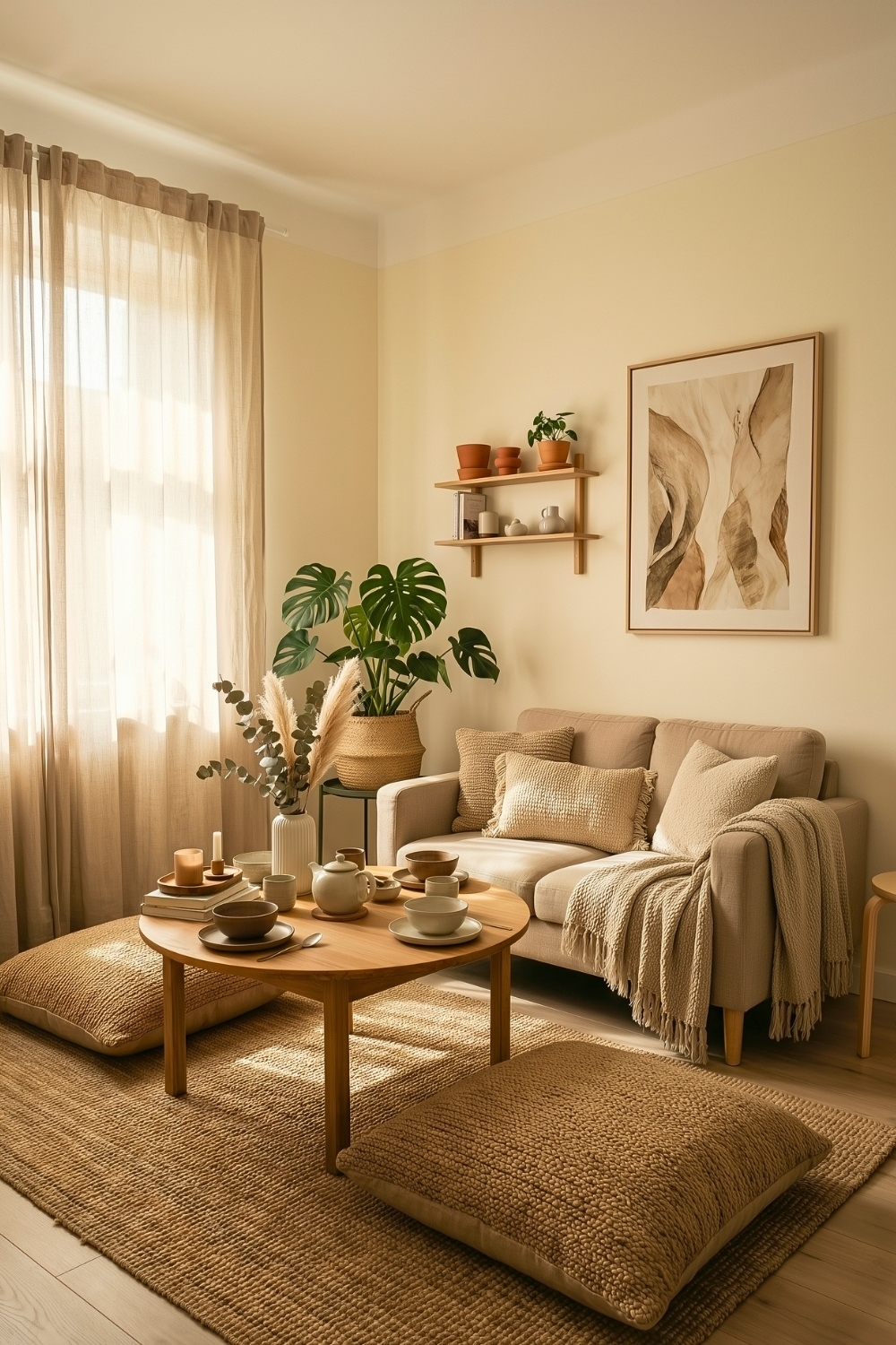 Sometimes I just want to ditch the chairs altogether and embrace a more grounded, boho feel that reminds me of slow weekend mornings. I love how this low wooden table paired with plush floor cushions and a textured jute rug turns a simple corner into an intimate eating space in the living room. This beige-toned layout is a brilliant budget-friendly fix for small spaces where you want to keep the vibe relaxed and the sightlines open.
