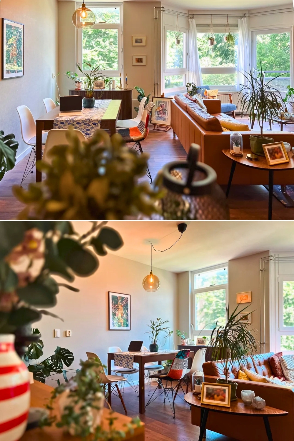 This cozy apartment from u/jadraist creates a perfect eating space in the living room using plants and natural light. I’m a huge fan of the Contemporary interior colors, like deep green, blue, and orange, which make the dual purpose living dining room feel intentional. Layered rugs help define the space while keeping everything airy.