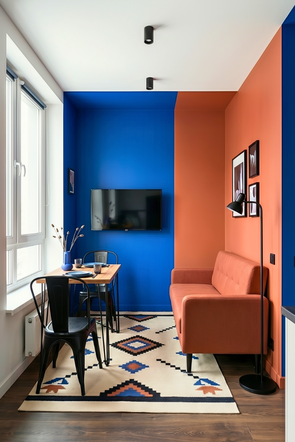 If you’re dealing with a long and narrow room, I find that using bold colors like this deep blue can actually make the interior feel more intentional and designer-led. This contemporary layout smartly places the dining table right by the window, letting natural light define the zone while a patterned rug ties the whole look together.