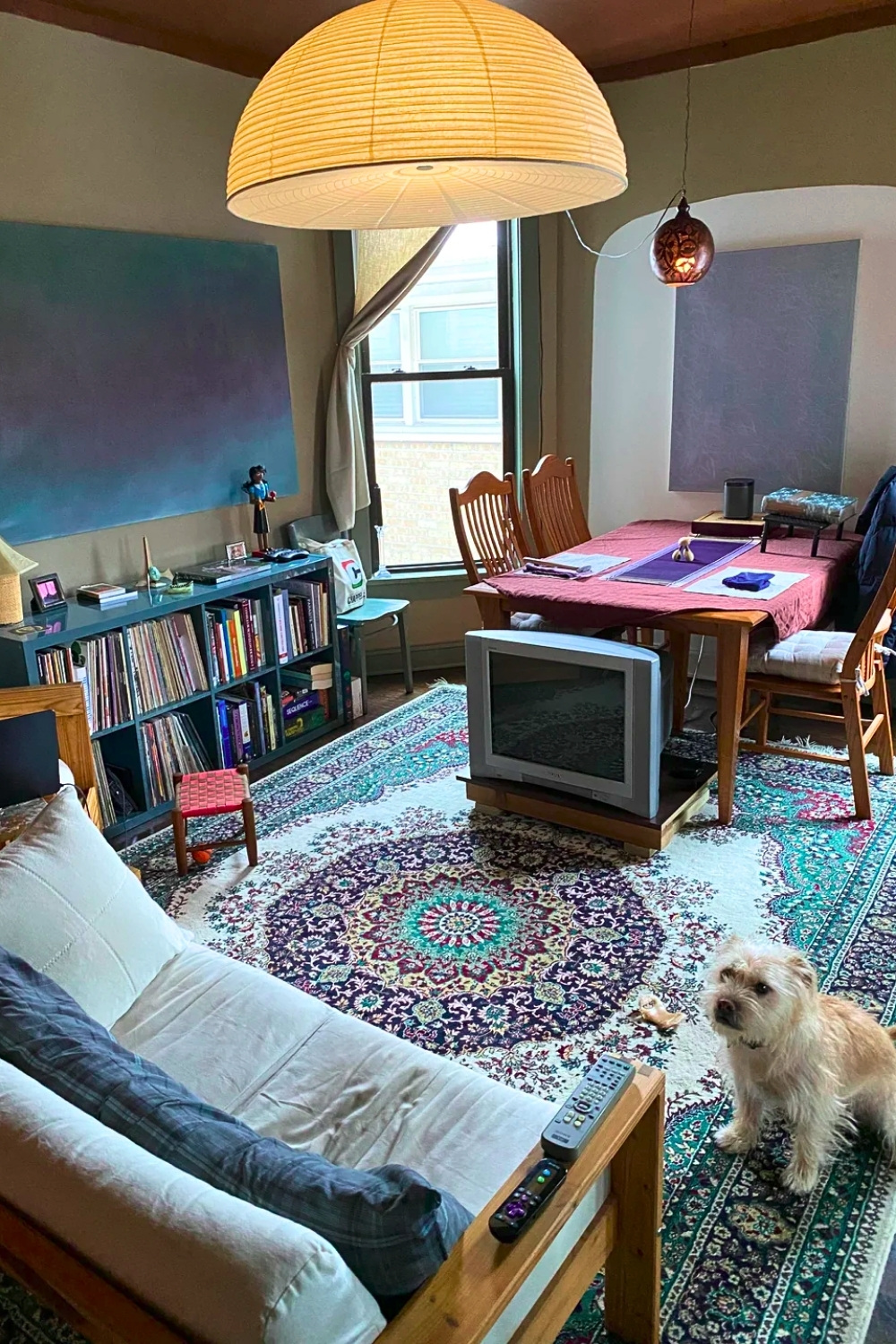 u/esherry574 took a unique open concept and made it feel perfectly balanced, especially with that clever low TV placement. Layered rugs and thrifted finds show how to build a dual purpose living dining room on a budget. The presence of the dog in the photos makes the whole creative vibe feel even more like a real home.