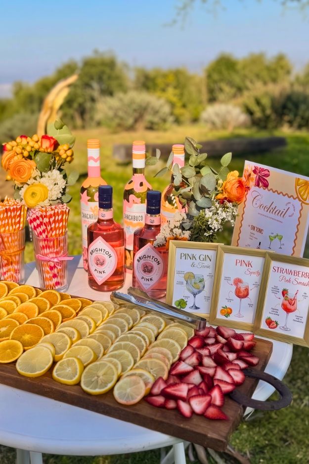 The pink bottles and cocktail menu cards give the station a playful personality. Instead of a basic drink table, it feels more like a small DIY cocktail bar where guests can mix something fun with fresh fruit. That kind of interactive setup always pulls people in.