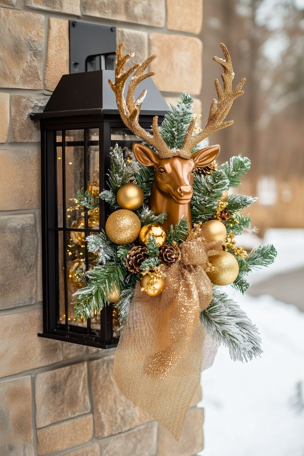 A gold reindeer looks stunning inside a black lantern, creating a perfect contrast.