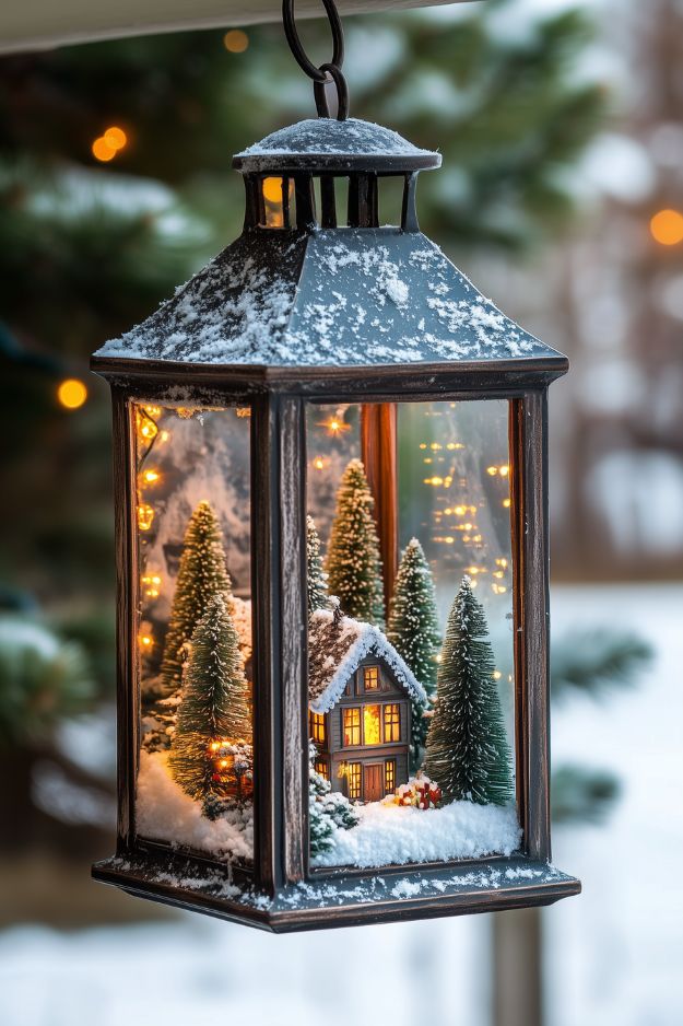 To create a charming scene, choose a lantern with a vintage design and add miniatures inside for an old-fashioned Christmas vibe.
