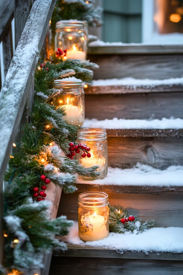 You can put mason jars to good use for this Christmas. To add some festive touch, you can use holly berries, pine, and battery-operating candles.