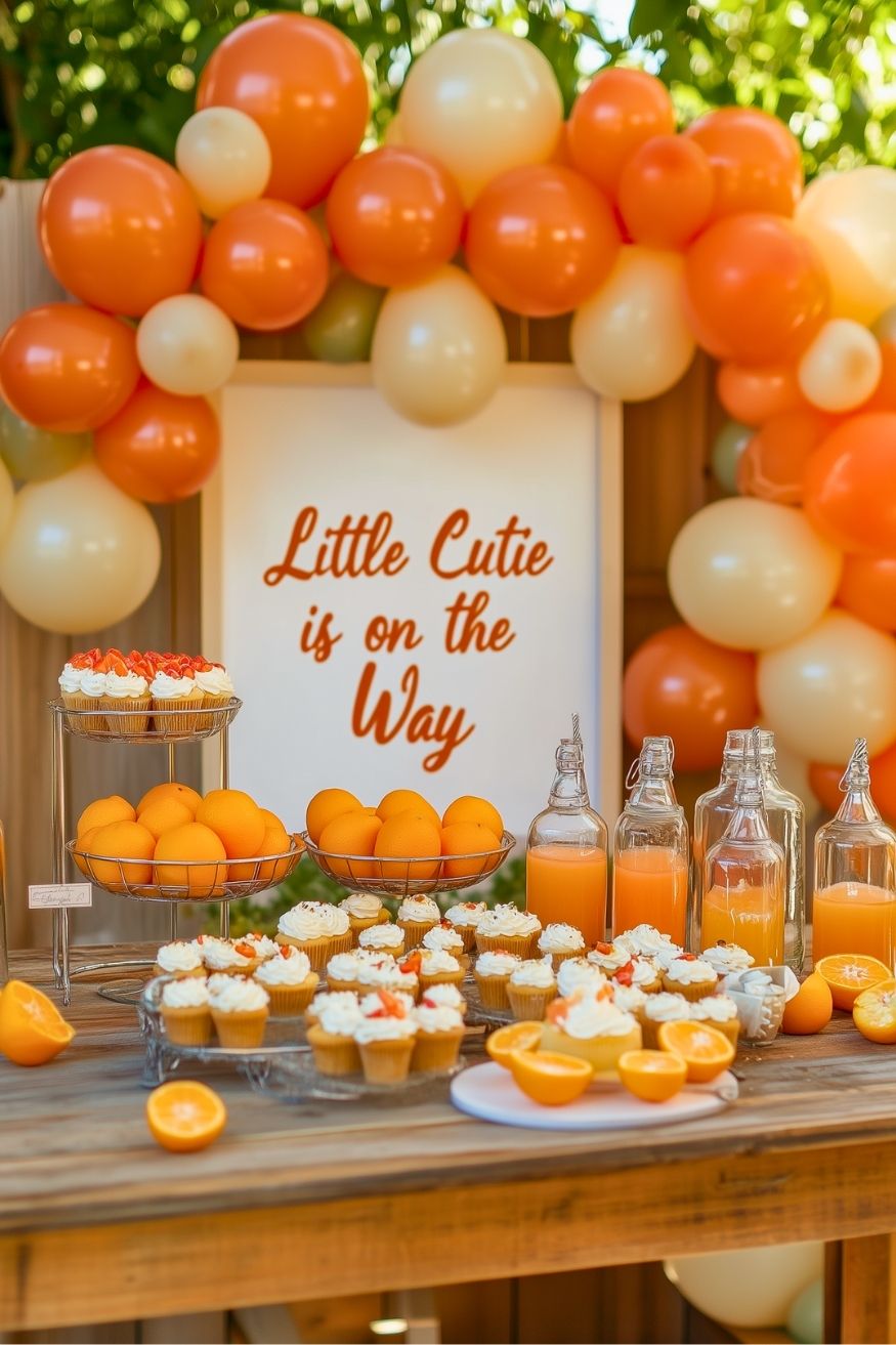 This “Little Cutie” setup feels like a sunny afternoon in a grove – warm, vibrant, and perfectly sweet. There’s something so effortlessly cheerful about using a citrus theme for a baby shower. It leans into a simple, cohesive color palette that pops beautifully against a natural wood backdrop. Want to recreate this at home? Use fresh oranges as your main decor! Pile them into wire baskets and use citrus slices to dress up simple cupcakes.