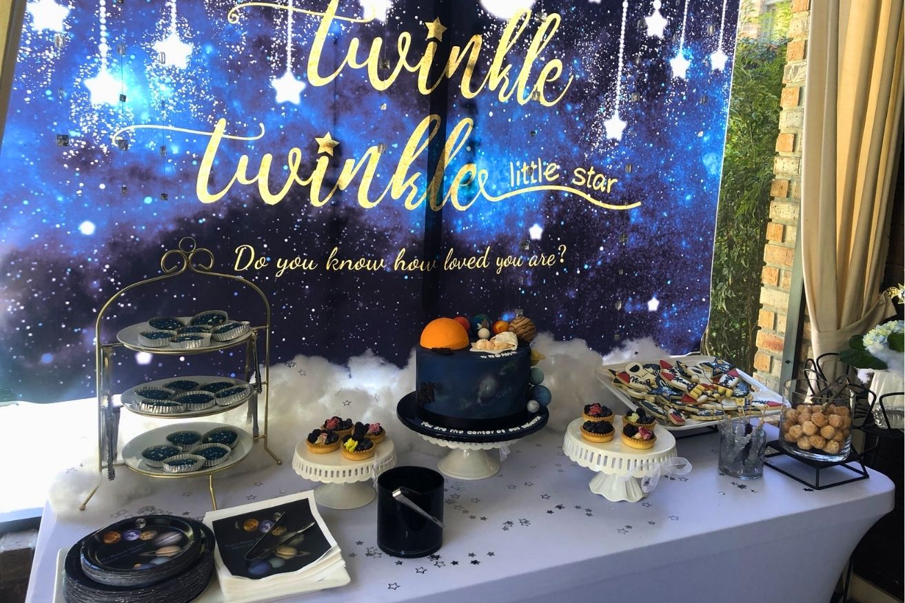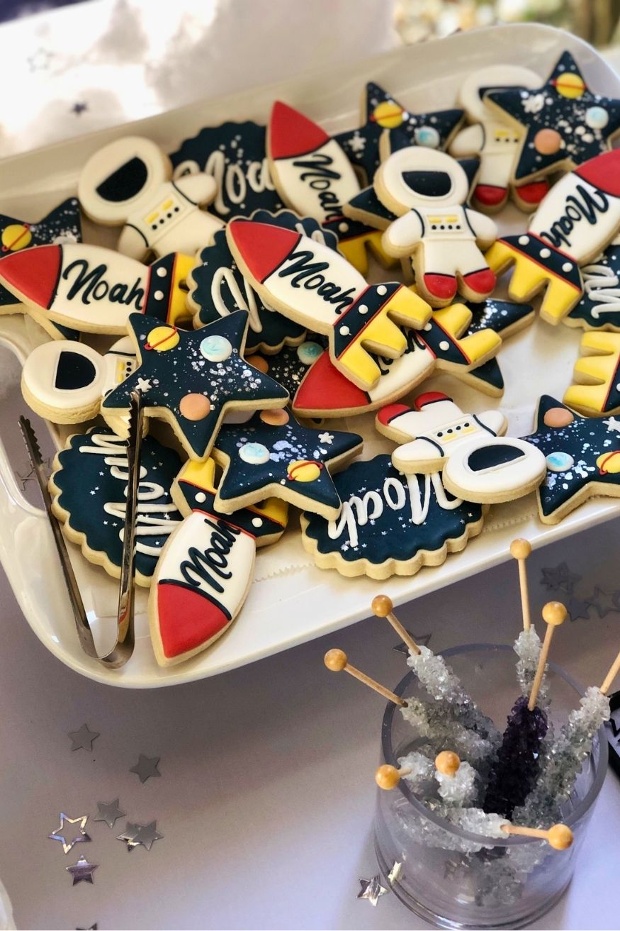 What stands out to me is how personal it is. Her son’s name, Noah, is printed on every single lovely cookie. Tying her PhD in planetary science into the theme in a way that feels meaningful, not forced. It’s one of those ideas that works because it actually reflects the person, which always ends up looking more memorable than any trend.