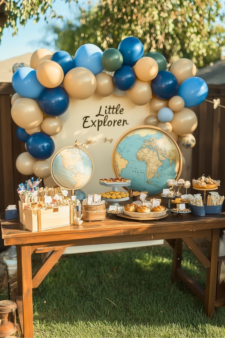 “Ready to see the world?” That’s what you will ask your baby boy this summer. This travel-themed setup is perfect for the little one with a big journey ahead. It feels grounded and adventurous, mixing deep navy and forest green with warm tan accents. It gives that “world-traveler” vibe without needing a massive budget or a passport!