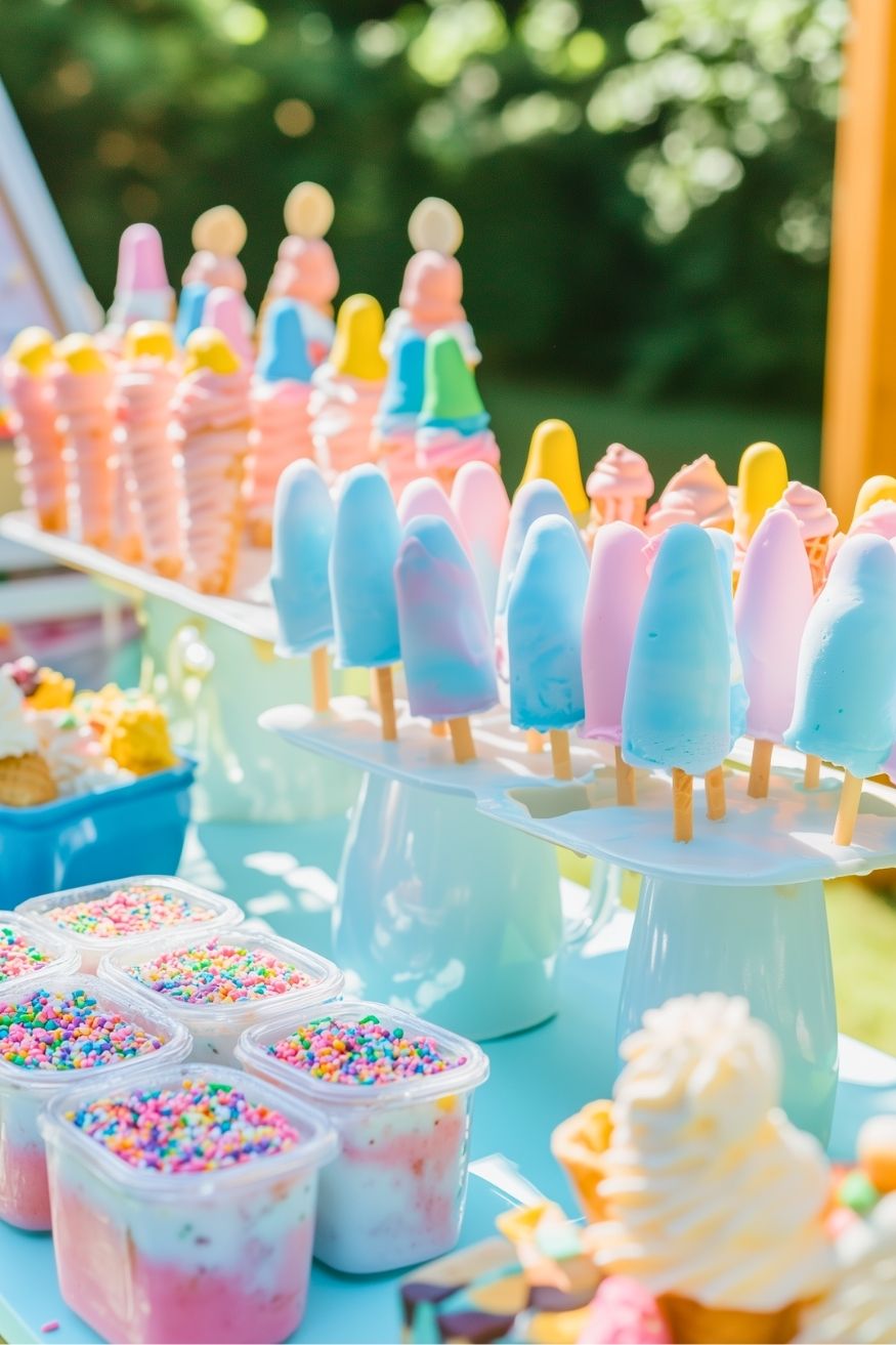 Is there anything better than a pastel-colored ice cream bar at a hot summer party? It’s the sweetest way to beat the heat while celebrating a new little one. And it beats me too! The mix of popsicles and sprinkles feels like pure, sugary joy!