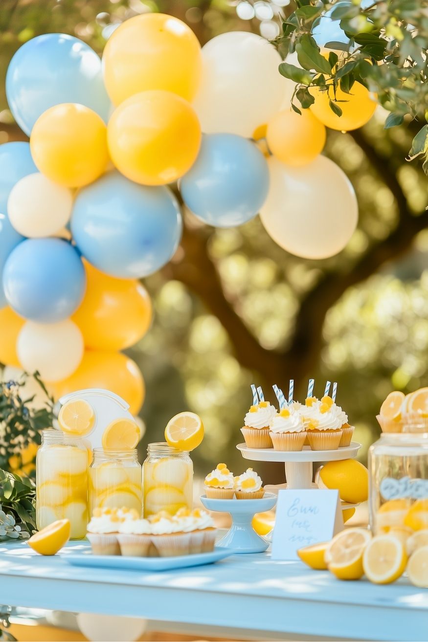 How about this one? Lemonade stands aren’t just for the neighborhood kids anymore; they even make for the most refreshing baby shower theme. This zesty yellow and blue setup feels incredibly bright and cheerful under the summer sun.