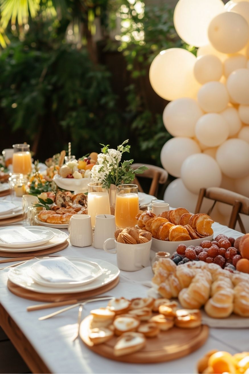 This setup looks so good since it relies on the food itself to act as the decor. Those piles of golden pastries and vibrant fresh fruits look absolutely incredible against a crisp white tablecloth.