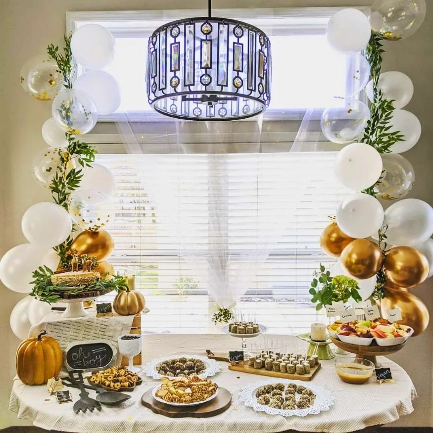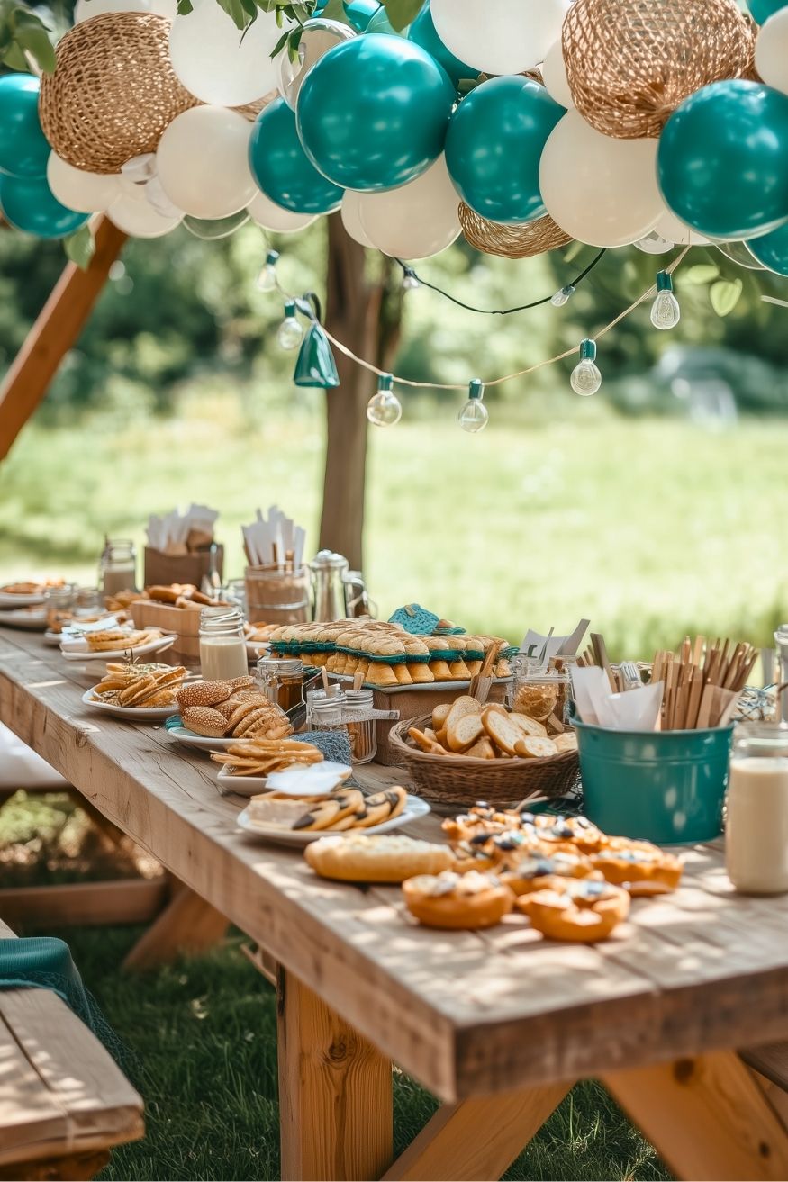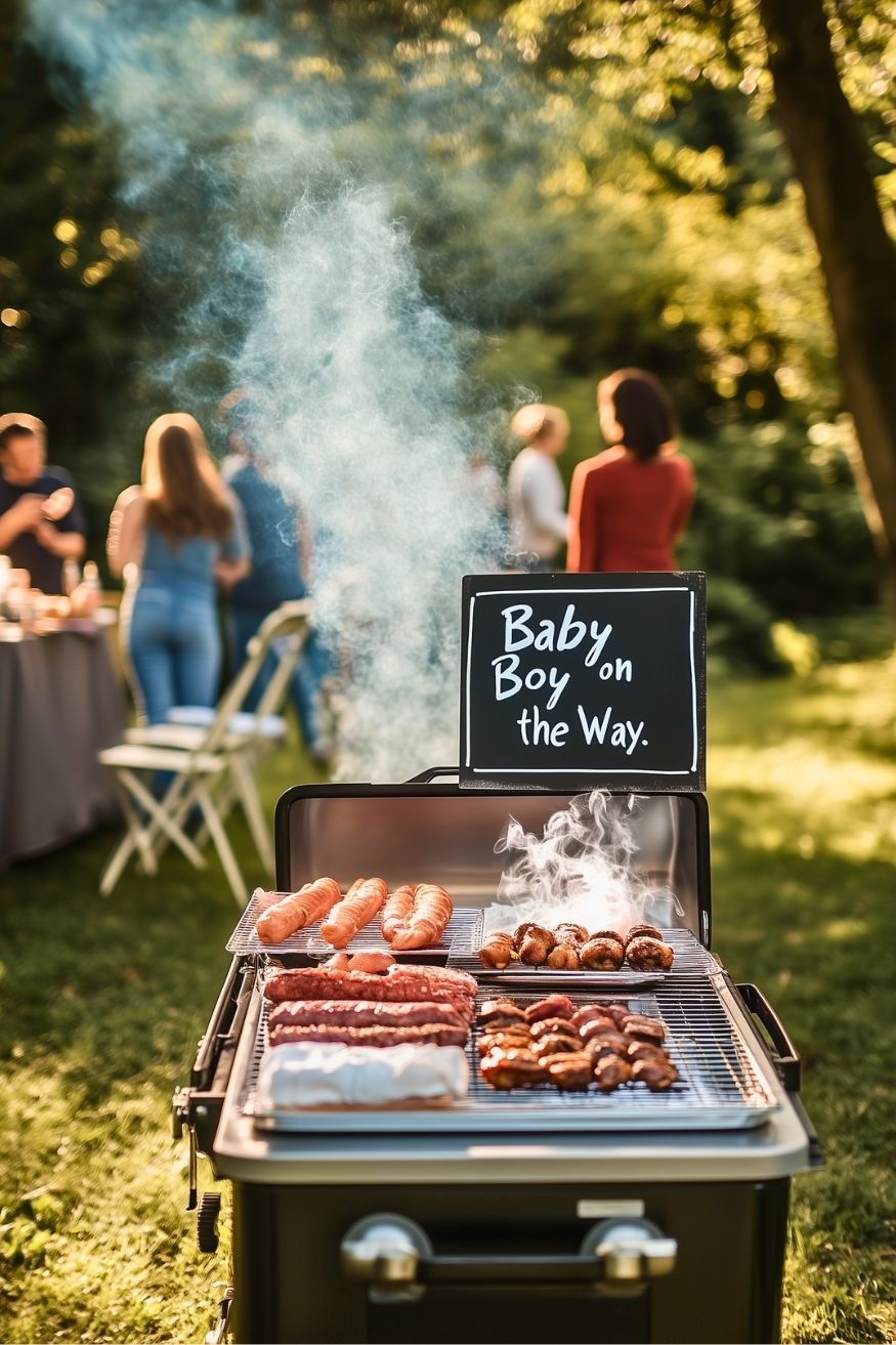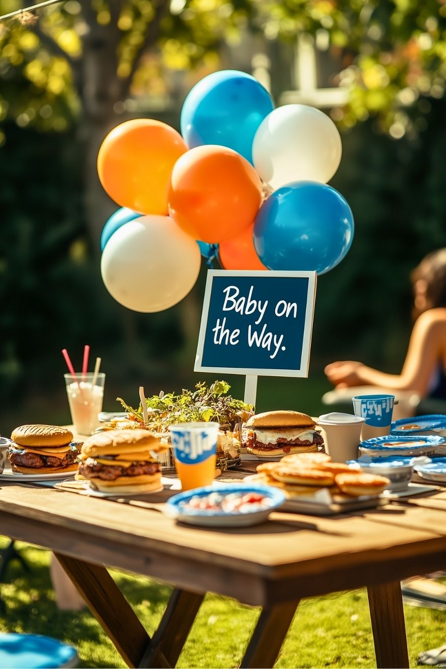 Sometimes the best parties are the ones centered around a great meal on a summer day! A “Baby on the Way” BBQ feels grounded, communal, and totally stress-free. It takes the pressure off fancy catering and leans into a casual, backyard vibe that everyone loves. As a DIY version, keep the decor simple with a few balloon clusters and a cute chalkboard sign.
