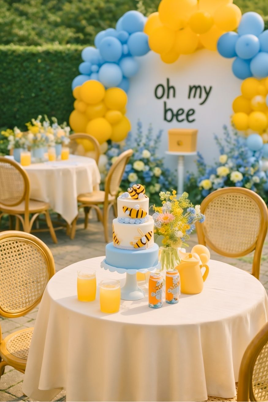 Okay, this one?? The “oh my bee” pun already wins me over, but the color combo is what really sells it. The mix of soft blue and bright yellow almost gives it that light summer garden vibe instead of something overly themed. The bee details are kept mostly on the cake and small accents, so it doesn’t feel cheesy.