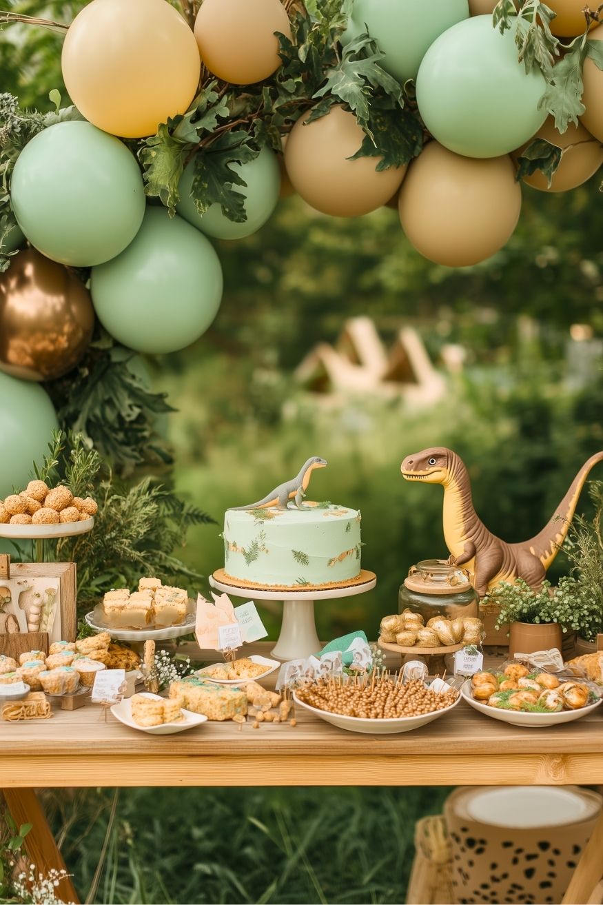Who knew dinosaurs could look so chic? This earthy, “prehistoric” setup swaps bright primary colors for a sophisticated palette of sage green, tan, and gold. It feels adventurous yet perfectly curated for a garden party. To bring this look home, grab some plastic dinosaur figurines and give them a quick coat of matte spray paint to match your color scheme.