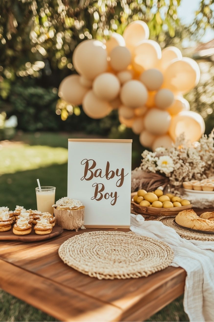 If you’re swooning over earthy neutrals, this modern woodland setup is an absolute dream. The mix of muted sage, cream, and warm beige balloons feels incredibly calming and grounded, offering a beautifully sophisticated take on a baby boy’s shower.