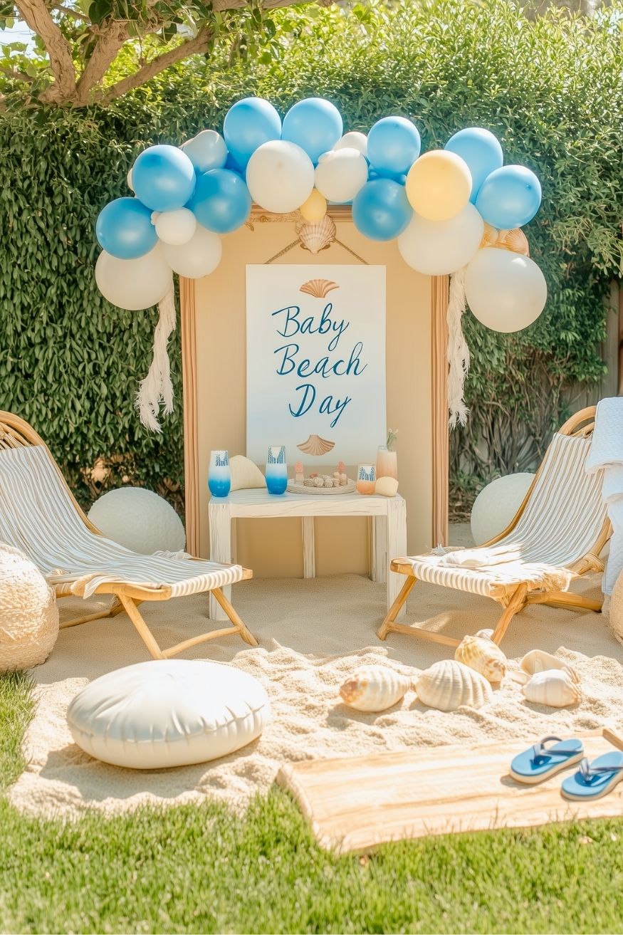 Between the sand, the seashells, and those striped loungers, this totally new idea brings the shoreline to the backyard with this “Baby Beach Day” setup. You just need a few key coastal elements.