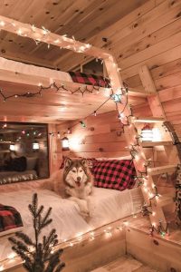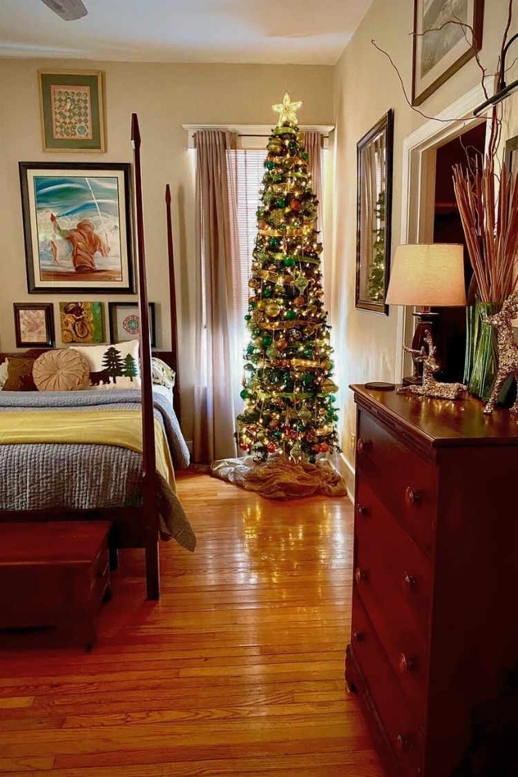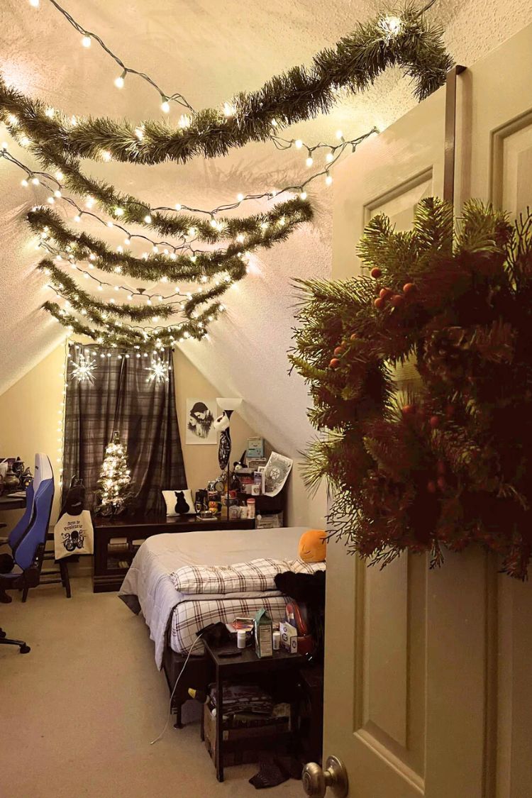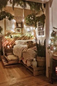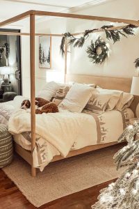 This is one of the coziest Christmas bedrooms that you can see online. I am a fan of rooms like this. It’s a perfect mix of rustic charm and Christmas magic. U/commonvanilla has done it so well. A chunky knit blanket and hung twinkle lights are getting along harmoniously in this winter holiday room. Just look how comfortable the doggie is on the bed, and you will see.