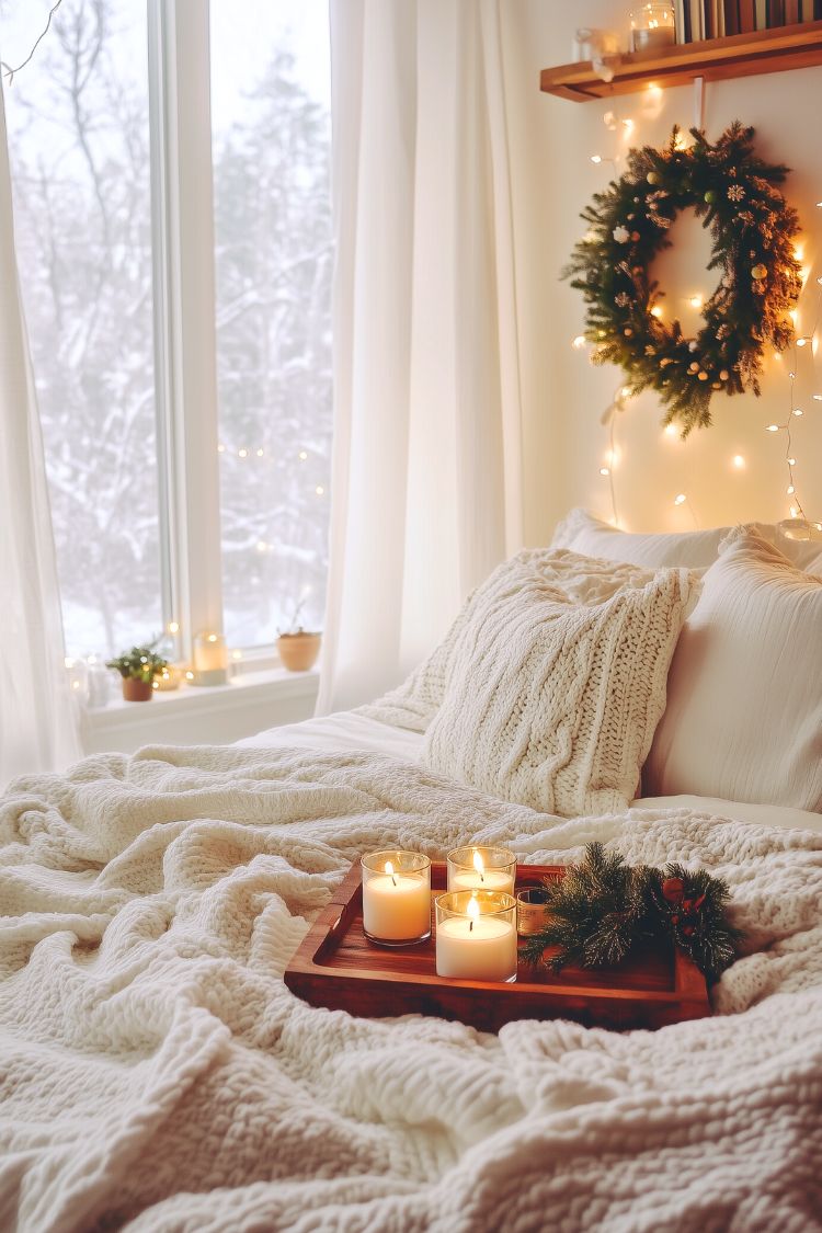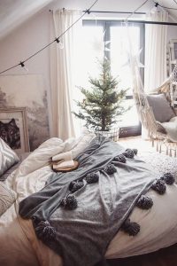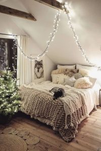 Instead of decorating the whole room, you can only focus on your bed and make it feel more personal. The white bed sheet and knitted blanket make everything look softer. It seems to bring an entire winter to the bedroom. Light up some scented candles and hold a hot cocoa in your hand, and suddenly the whole room feels like winter distilled into one cozy nook.