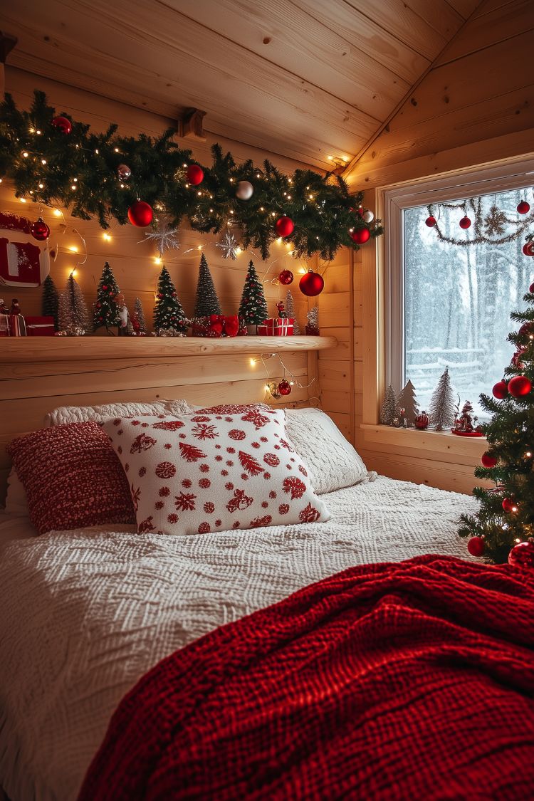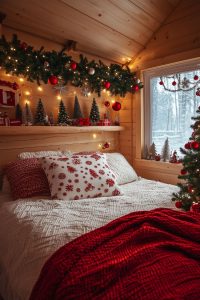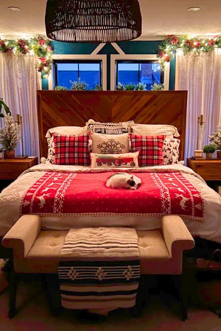u/non-fungible_tubbins will show you how a larger bedroom can feel immediately festive with just a few changes. A red and white dresser covered with a layer on a bed. You can add more with some fairy lights strung on the ceiling, and the mix of garlands and baubles. The little cat is really savoring the time here. I can see how inviting the room is on long winter nights.