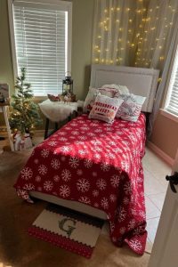 I found this sweet pink Christmas bedroom by u/beantheredonethat333. She actually cares about every corner in the room. I personally like the cherry blossom color of the plaid pillow, which pairs well with the blanket on the bed. The way she mixes and blends green and pink in decorating for Christmas doesn’t look like the other one. It’s a bold decision, but it turns out to be a good outcome.