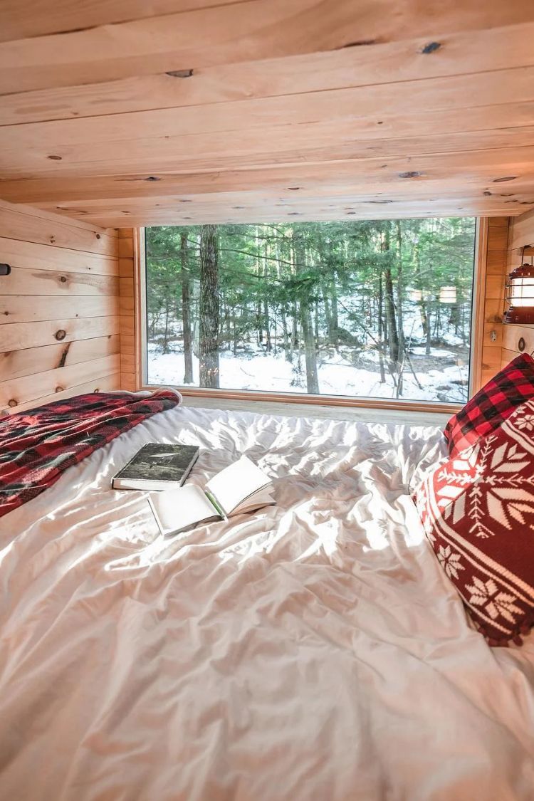 Here is another room of u/commonvanilla in the New Hampshire forests. Just a basic winter bedroom, but it radiates warmth in such a subtle way. I can say that the patterned pillows stand out and give the cabin room its charm and spaciousness. I wonder how cold it must be by the window while watching the winter unfold. However, the scenery outside is picturesque and actually breathtaking.