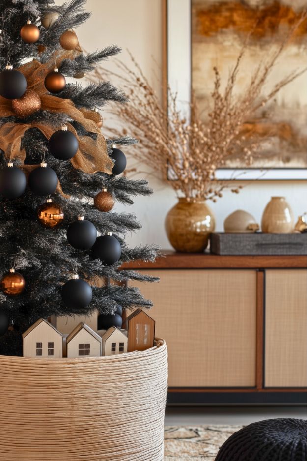 This black and copper combo feels way more grown than red and green Christmas. It has that moody, warm glow that makes everything feel cozy without being too sweet or cheesy.