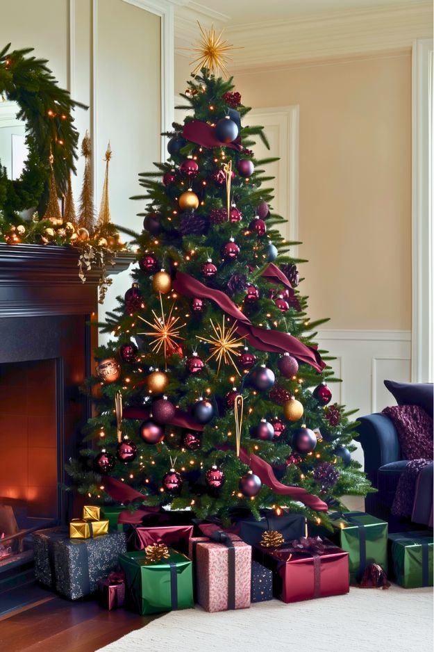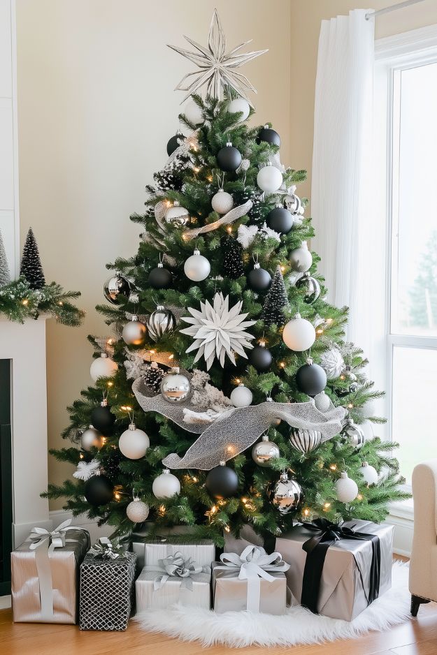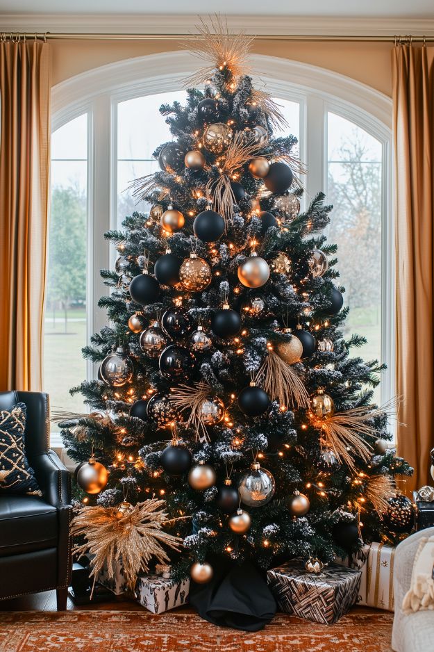 Black with silver and gold just hits differently. It feels like a Christmas tree that belongs in a modern, calm home that still wants a bit of drama. The black makes the metallics pop in a quiet, confident way, and mixing matte baubles with glossy ones makes it look layered and expensive without being overdone