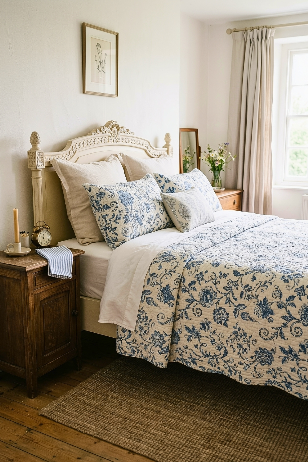 Sometimes you only need a single focal point, like an ornate vintage headboard, to really define your style. I often recommend using a vibrant blue floral quilt against neutral walls to get that farmhouse charm without overcomplicating things. Simple changes, such as adding a woven carpet and a wooden nightstand, create a cozy space where the details of the bed can shine.