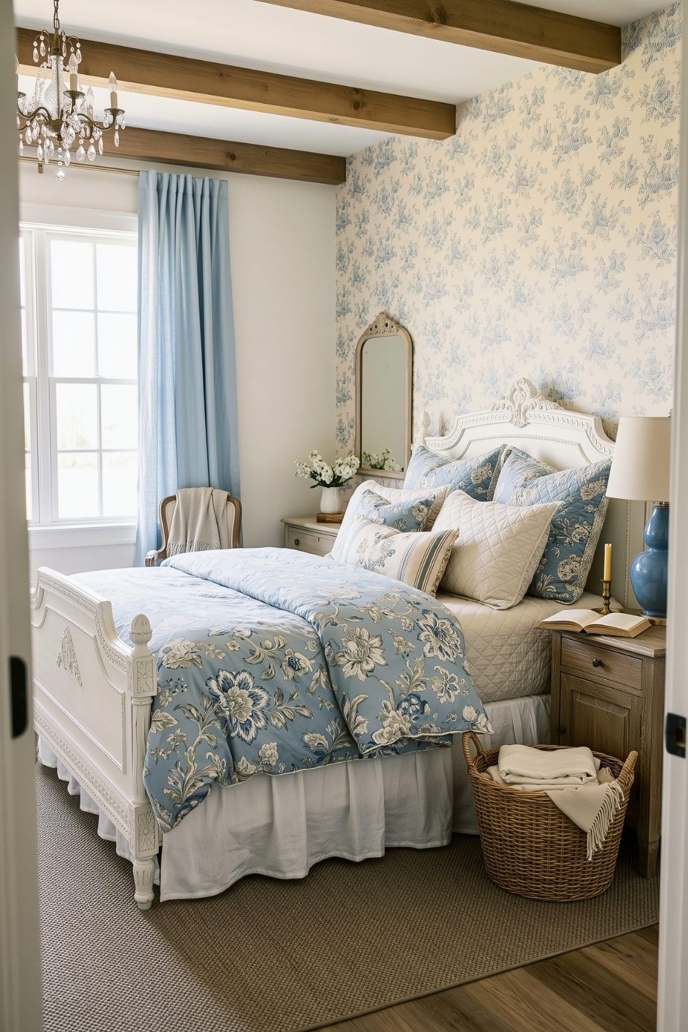 A delicate blue floral wallpaper can work wonders when you coordinate it with matching bedding for a cohesive French country look. I think the dark wood beams across the ceiling add a nice rustic touch that grounds the airy space. You could easily recreate this style by mixing patterns in the same color family for a polished but lived-in feel.