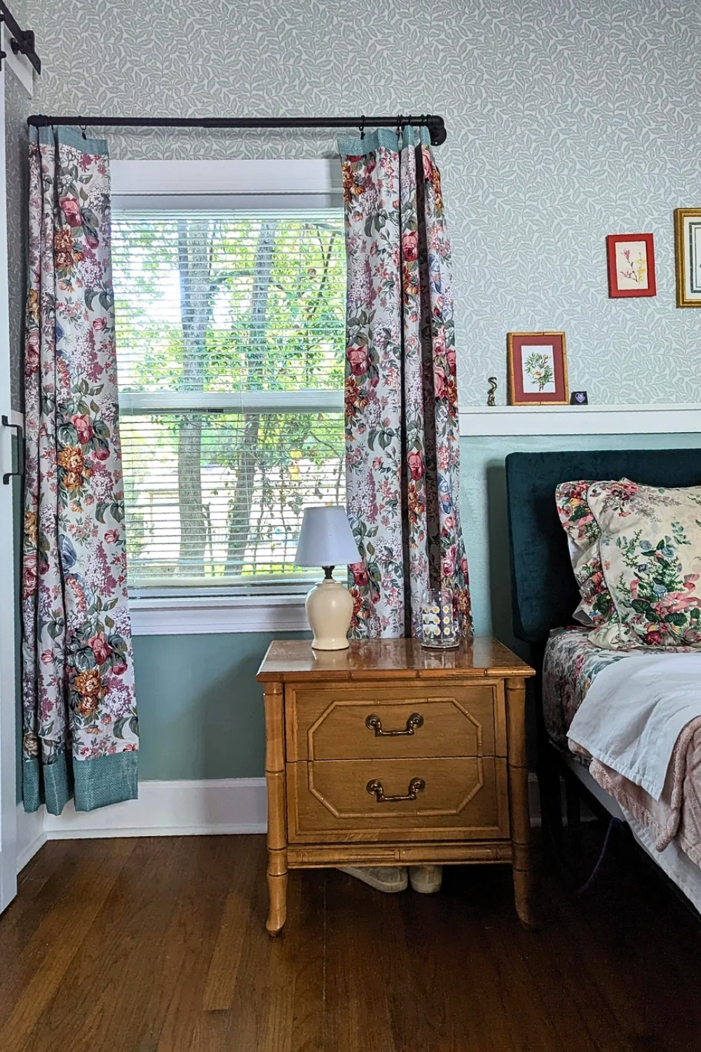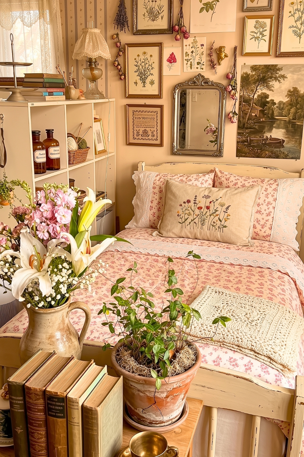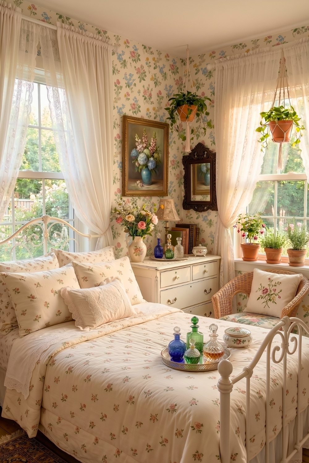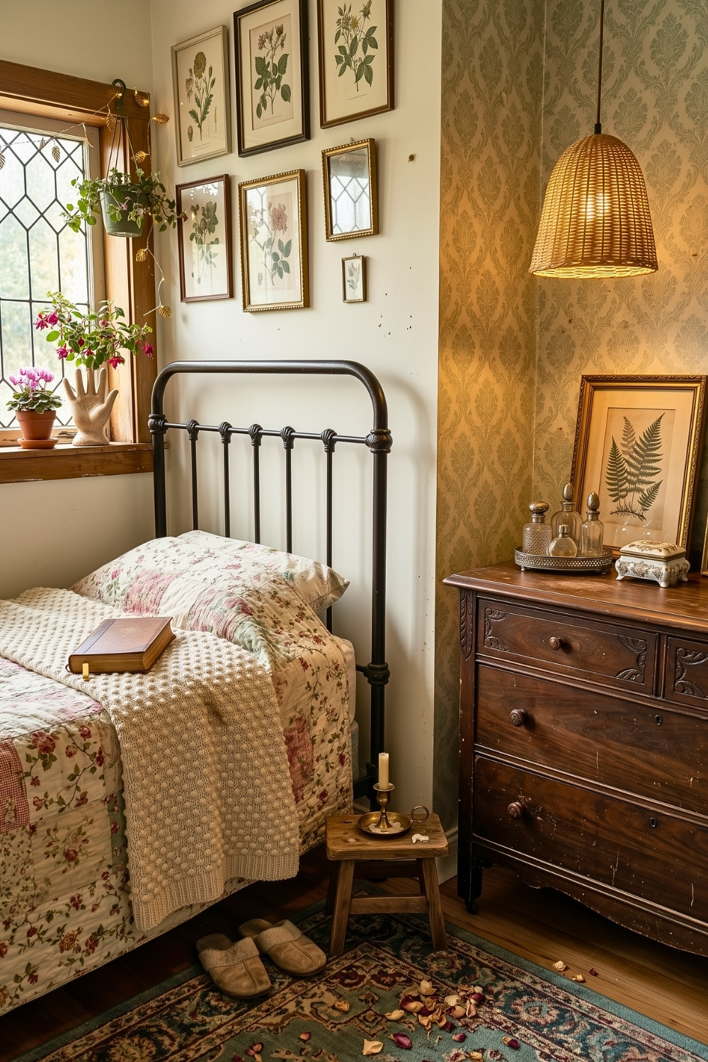 I like how a dark metal bed frame adds the right amount of weight to a room full of soft florals. You can see how the deep wood furniture tones bring out that grounded, earthy feel that makes a vintage space so welcoming. I think placing a simple wooden stool as a nightstand is a smart way to keep things functional and charming.