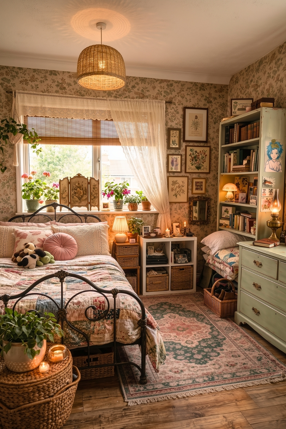 A vintage wrought iron bed frame mixed with a patchwork quilt instantly makes a bedroom feel like a cozy retreat. I’m a big fan of the warm glow from the wicker light and how it highlights the floral wallpaper. Adding green plants and a patterned carpet gives the whole area that lived-in farmhouse style many of us crave.