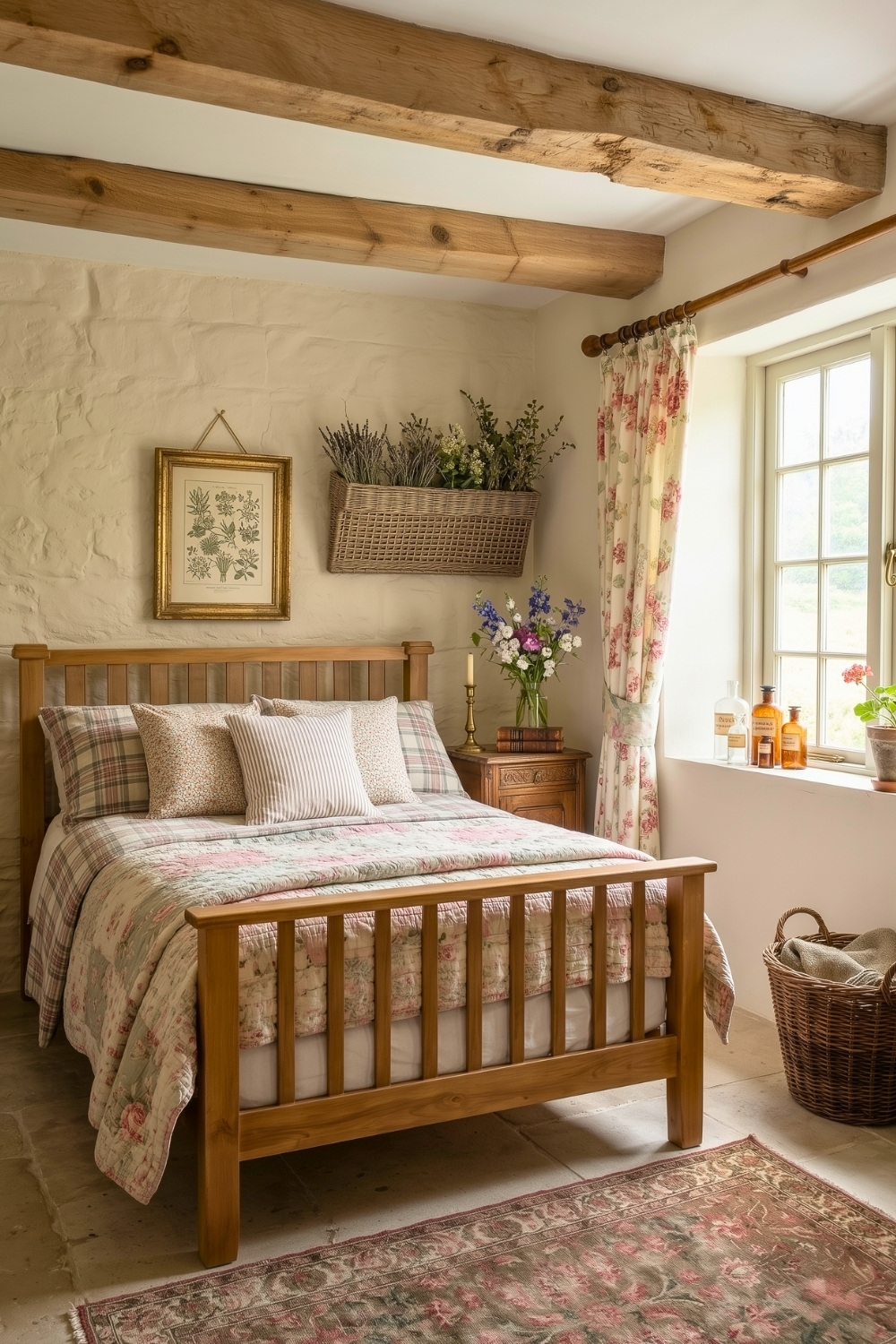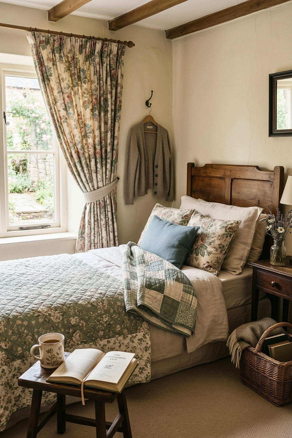 Mixing different patterns, like these floral curtains and green bedding, creates a very warm and lived-in aesthetic. I always tell my friends to add a simple wooden stool for their morning tea to make a small corner feel like a sanctuary. Those exposed ceiling beams really pull the whole farmhouse design together and make the entire bedroom feel cozy.