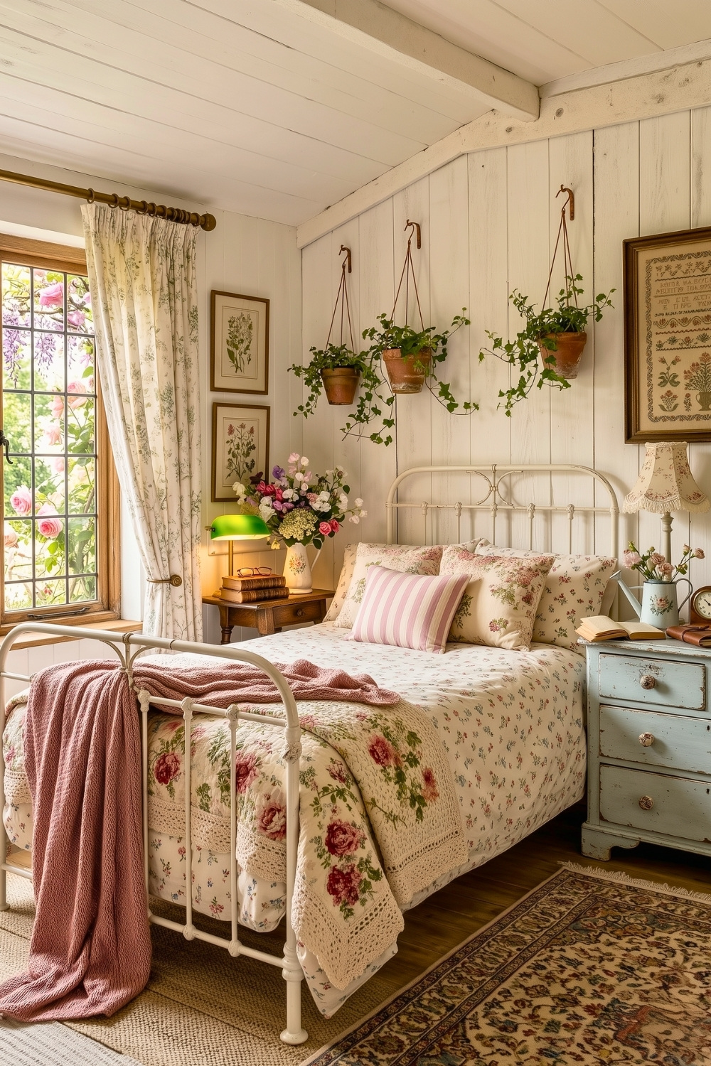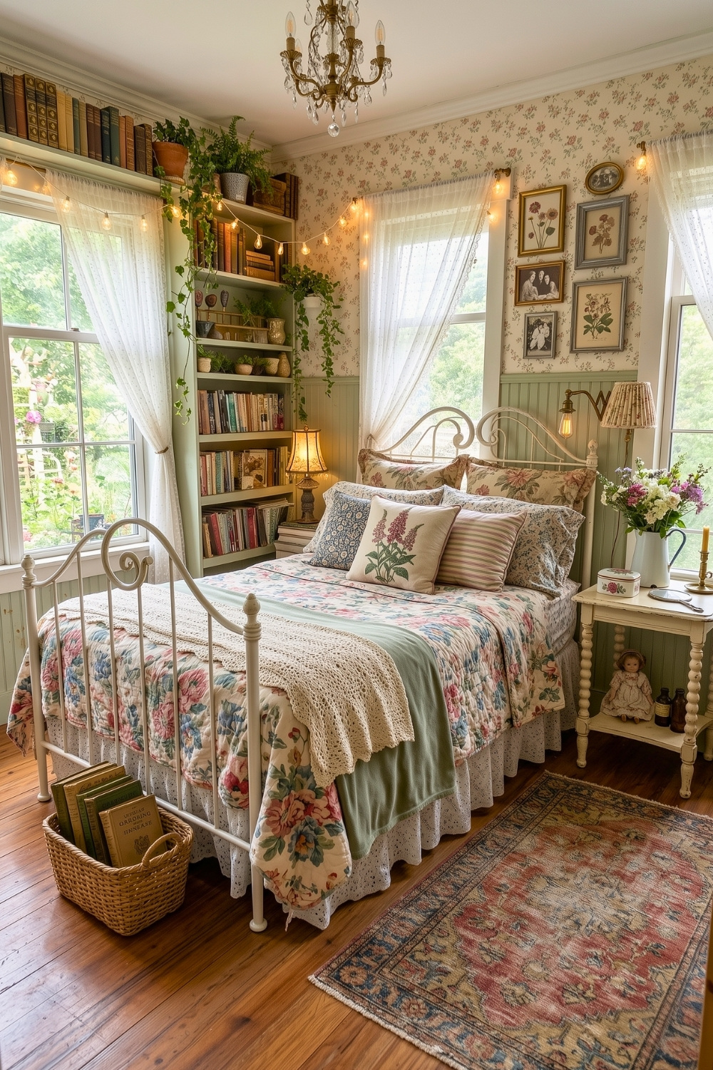 I find that busy floral wallpaper works beautifully when you pair it with a simple, airy curtain. The pops of blue and green in the bedding bring a cheerful, colorful energy that reminds me of an English cottage. I love how opening the wooden windows lets that garden aesthetic flow right into the room.