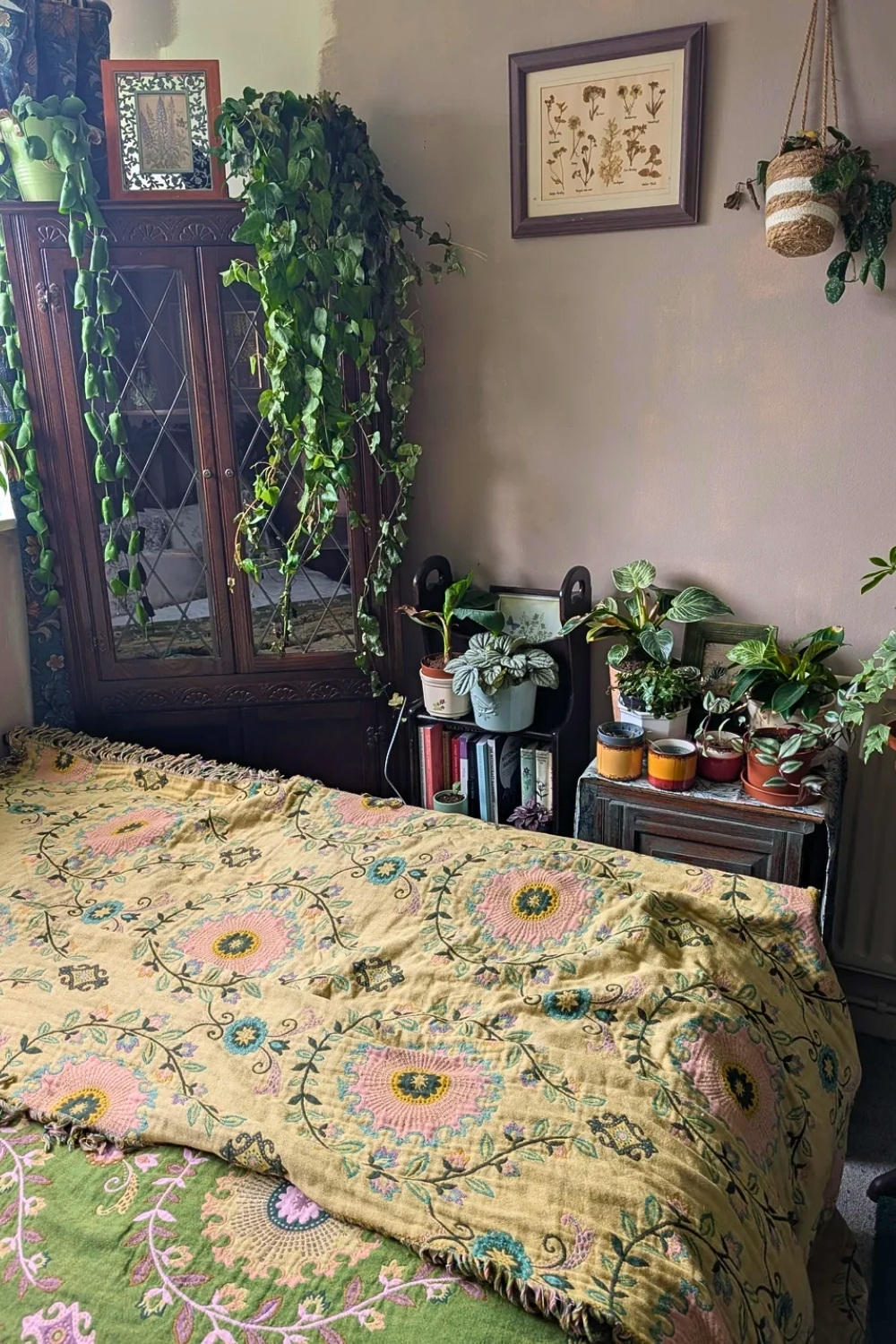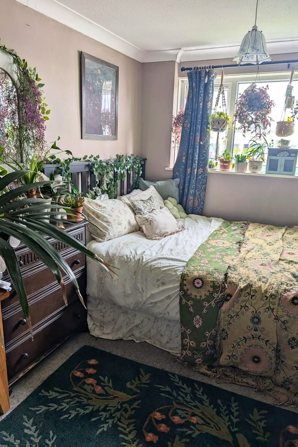 Looking at u/No_Connection9635’s room, I love how a lush green carpet and matching floral bedding can turn a space into a forest-inspired escape. Many people were asking where that rug came from because it gives off such a strong earthy aesthetic that fits the English cottage vibe so well. The dark furniture cabinet is a great spot for plants, and I think that blue curtain provides a nice bit of contrast to the design. You might want to try adding a colorful blanket to your bed to instantly boost your own farmhouse charm.