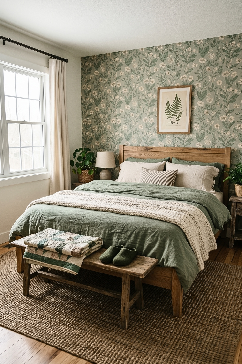Sage green bedding paired with botanical art is a great choice if you prefer an earthy palette. I’d suggest using simple wooden furniture to balance out a bold wallpaper pattern so the room stays peaceful. To me, this is one of the best ideas for bringing nature indoors while keeping a clean, modern design.