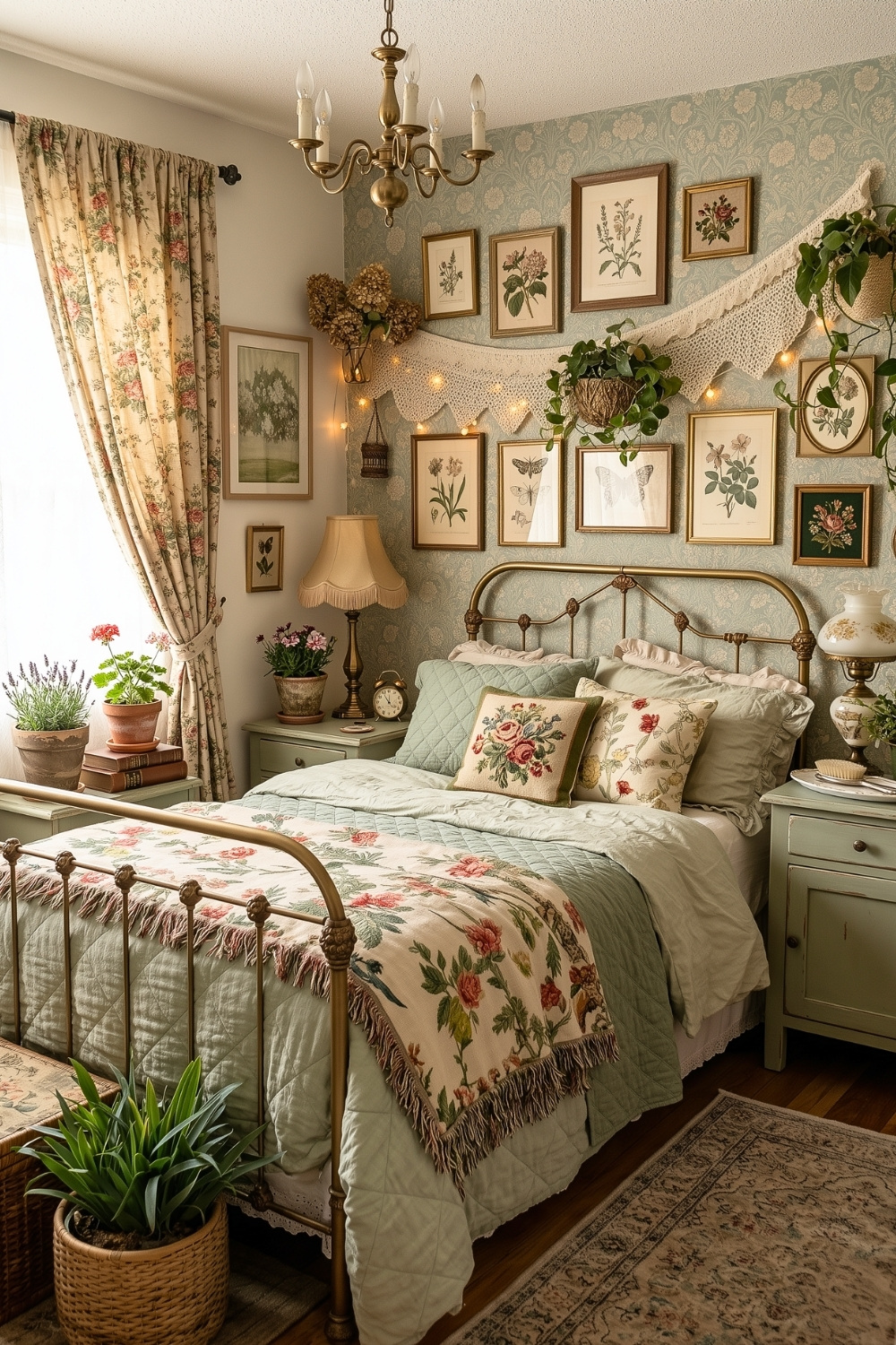 To get an authentic French country look, I recommend mixing antique brass accents with a soft mint green palette. Hanging a collection of botanical sketches above the headboard is a classic English cottage style choice that adds character to the walls. I find that draped lace and warm lighting make the entire aesthetic feel high-end and perfectly lived-in.