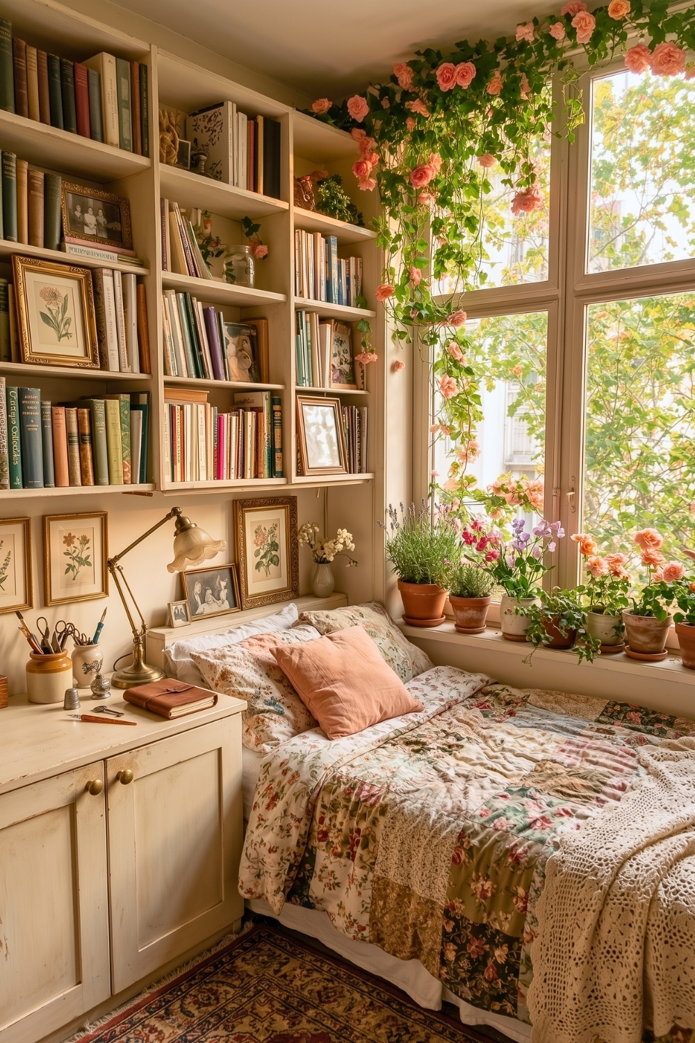 Decorating a smaller room with plants along the windowsill creates a lush, garden-like atmosphere I really enjoy. The floor-to-ceiling bookshelves frame the bed perfectly, creating a dream English cottage aesthetic for a book lover. Climbing roses draping from the ceiling bring the outdoors inside to brighten up the earthy wood furniture.
