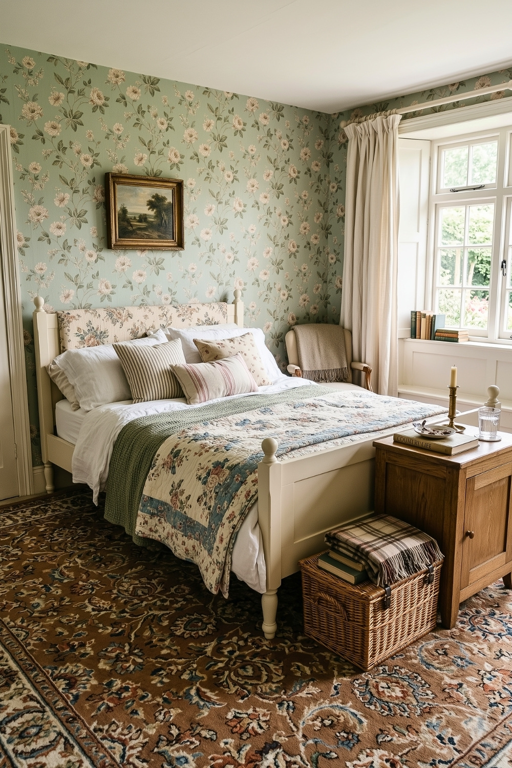 High-quality green wallpaper with a soft floral print can transform any plain wall into a beautiful English cottage focal point. I think an ornate carpet under the bed adds just enough texture to keep the room from feeling empty or cold. Using a vintage wicker basket for extra blankets is a clever way to add storage while keeping a classic style.