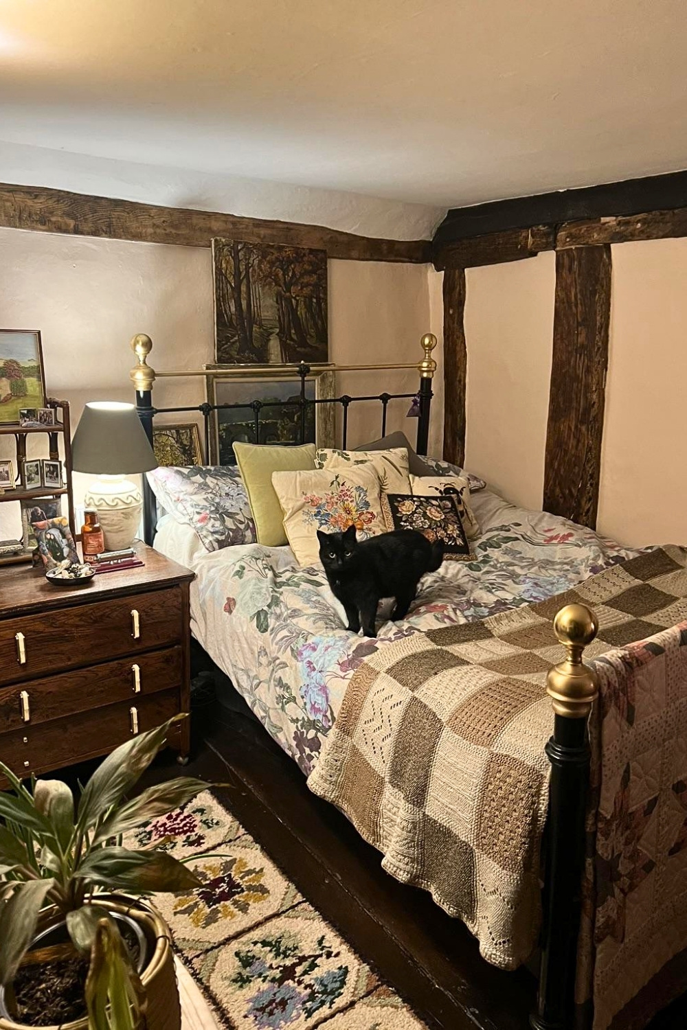 The 700-year-old Tudor beams u/Prunetown has are something I’m honestly obsessed with because they have a raw, historic style. When the sunlight hits the walls, the brown checkered blanket and thrifted oil paintings create a timeless French country feel. I’ve noticed that propping art right on the headboard is a clever design trick if you want to keep old walls pristine. I bet that having a little black cat on the bed makes this feel like the ultimate cozy hideaway to you.