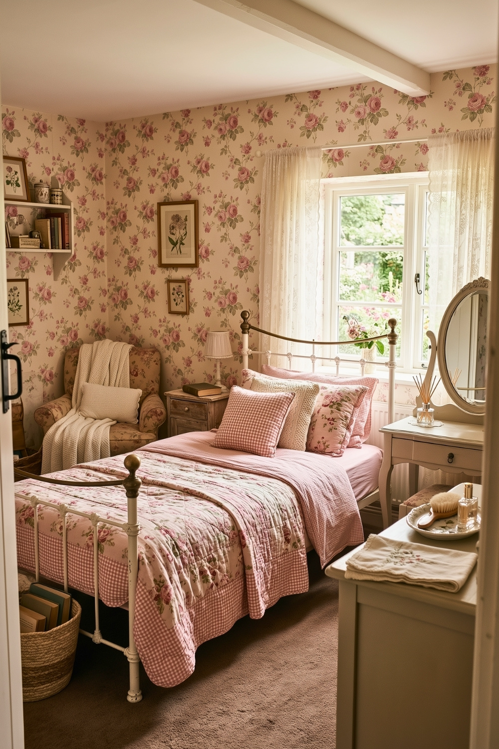 Warm pink floral patterns and charming ruffled layers really bring a classic English cottage vibe to life here. I find that using a vintage metal bed frame keeps the room feeling timeless, especially when you have a cozy armchair nearby. Small bedrooms really benefit from this aesthetic because the soft colors keep things feeling open and inviting for a girl or a guest.